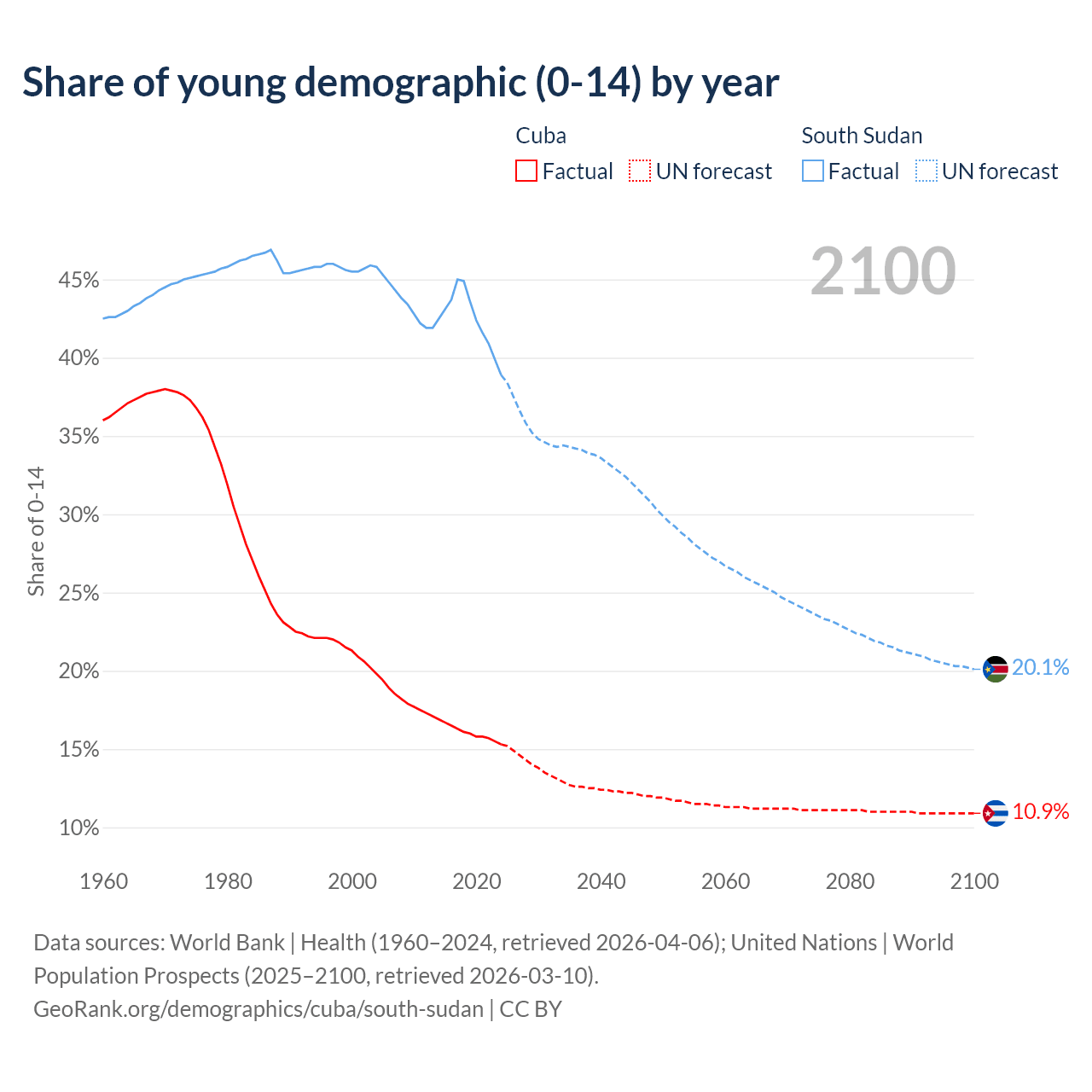 - The share of young demographic (0-15 years old) in Cuba is 15.3% vs 38.9% in South Sudan.