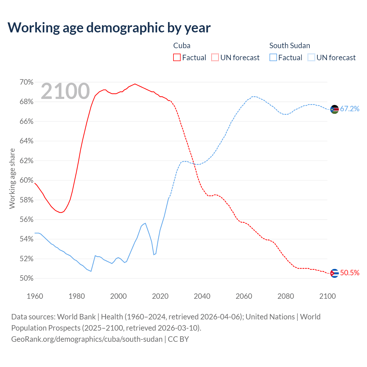 - Cuba has 7.42M working age adults (aged 15-64) vs 7.27M in South Sudan.