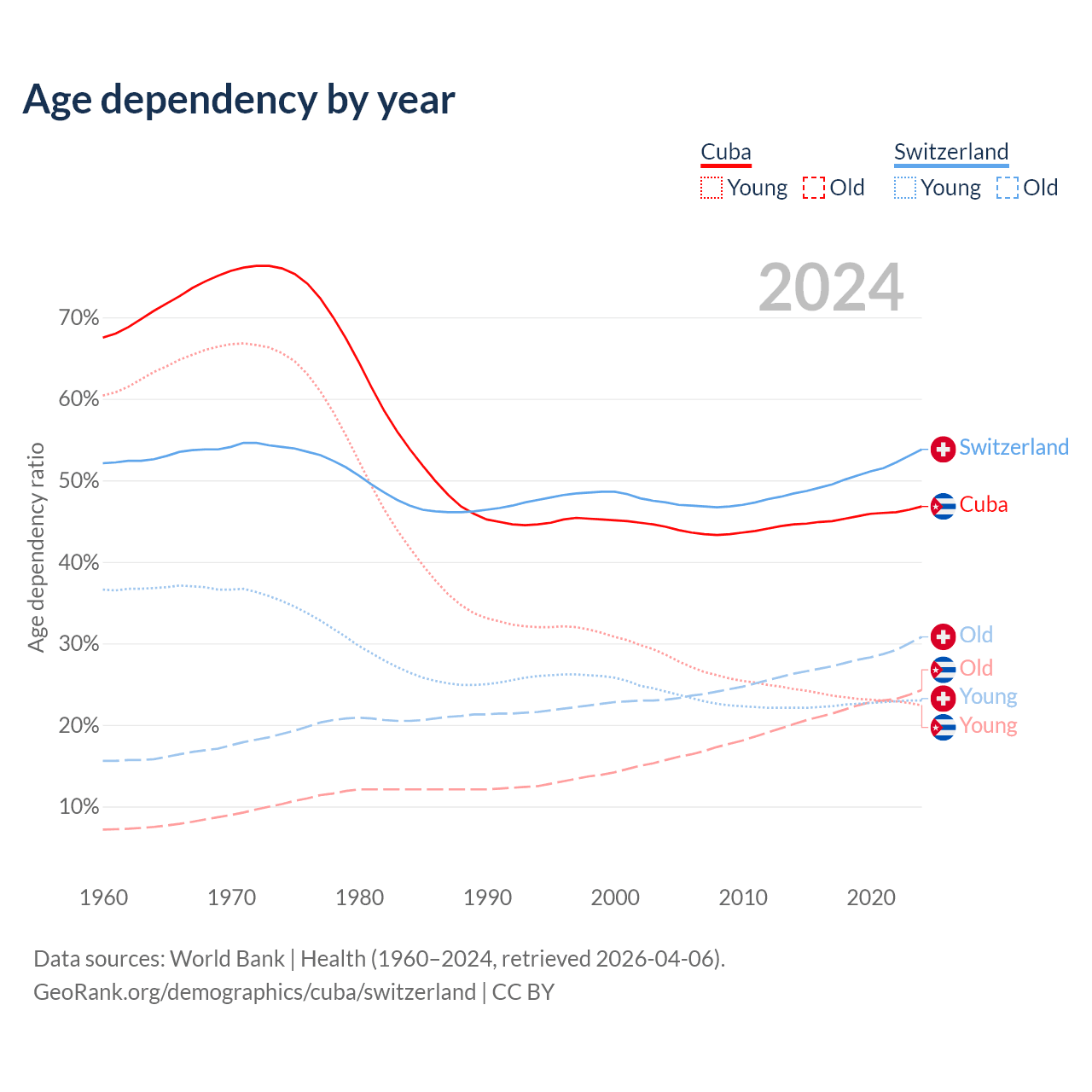 - Cuba is ranked 27/196 by median age (oldest to youngest) vs 24/196 for Switzerland.