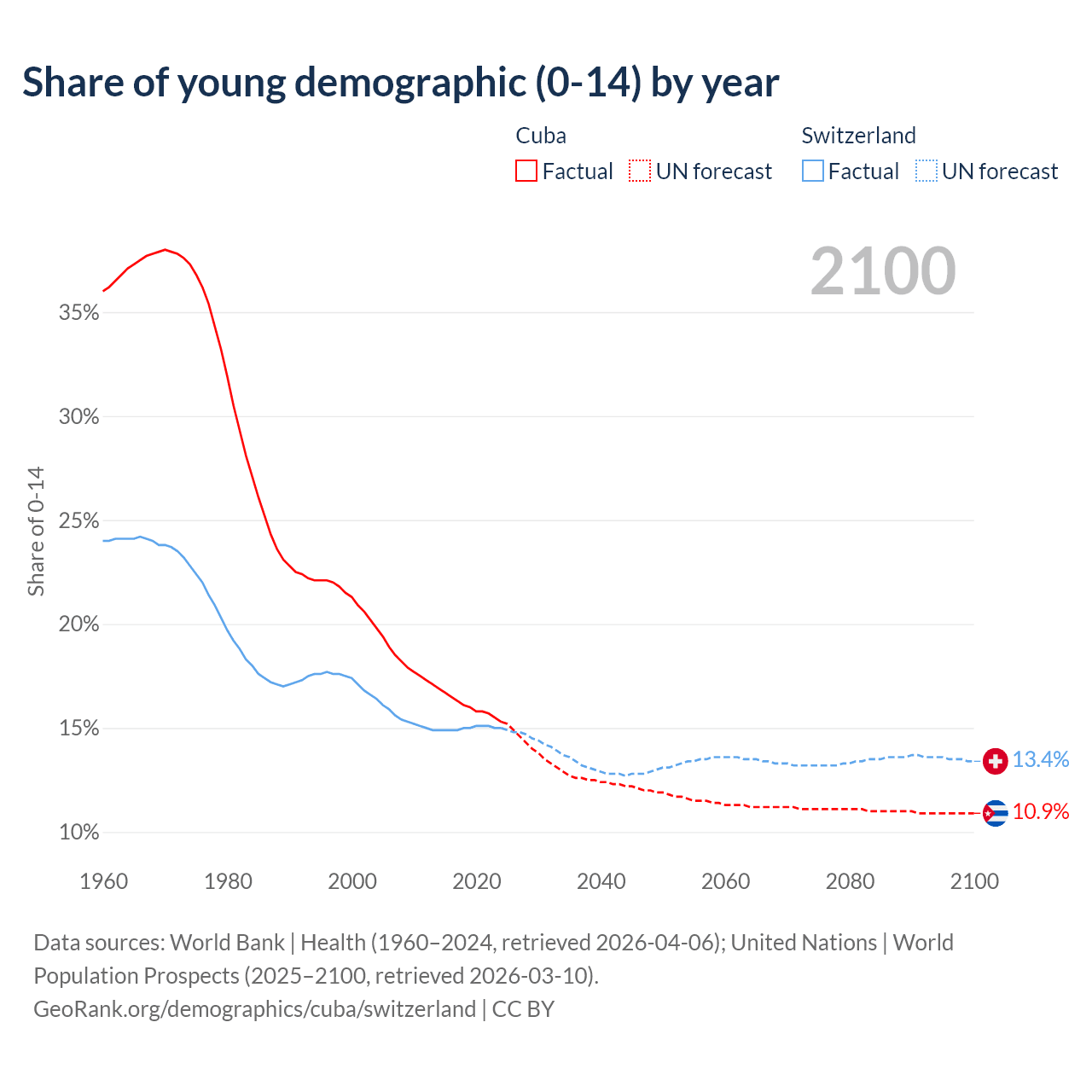 - The share of young demographic (0-15 years old) in Cuba is 15.3% vs 15% in Switzerland.