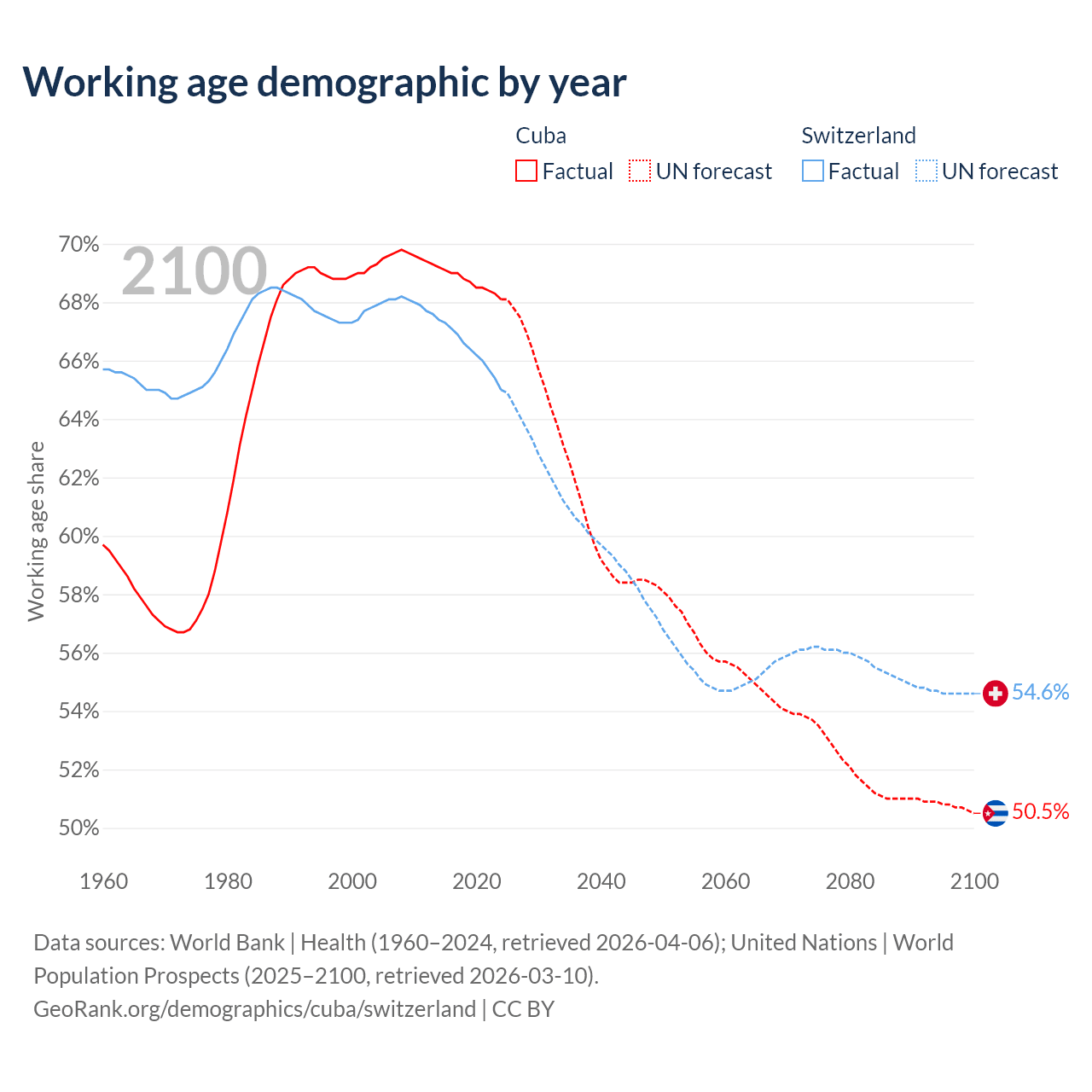 Median age Cuba vs Switzerland, 1960-2100