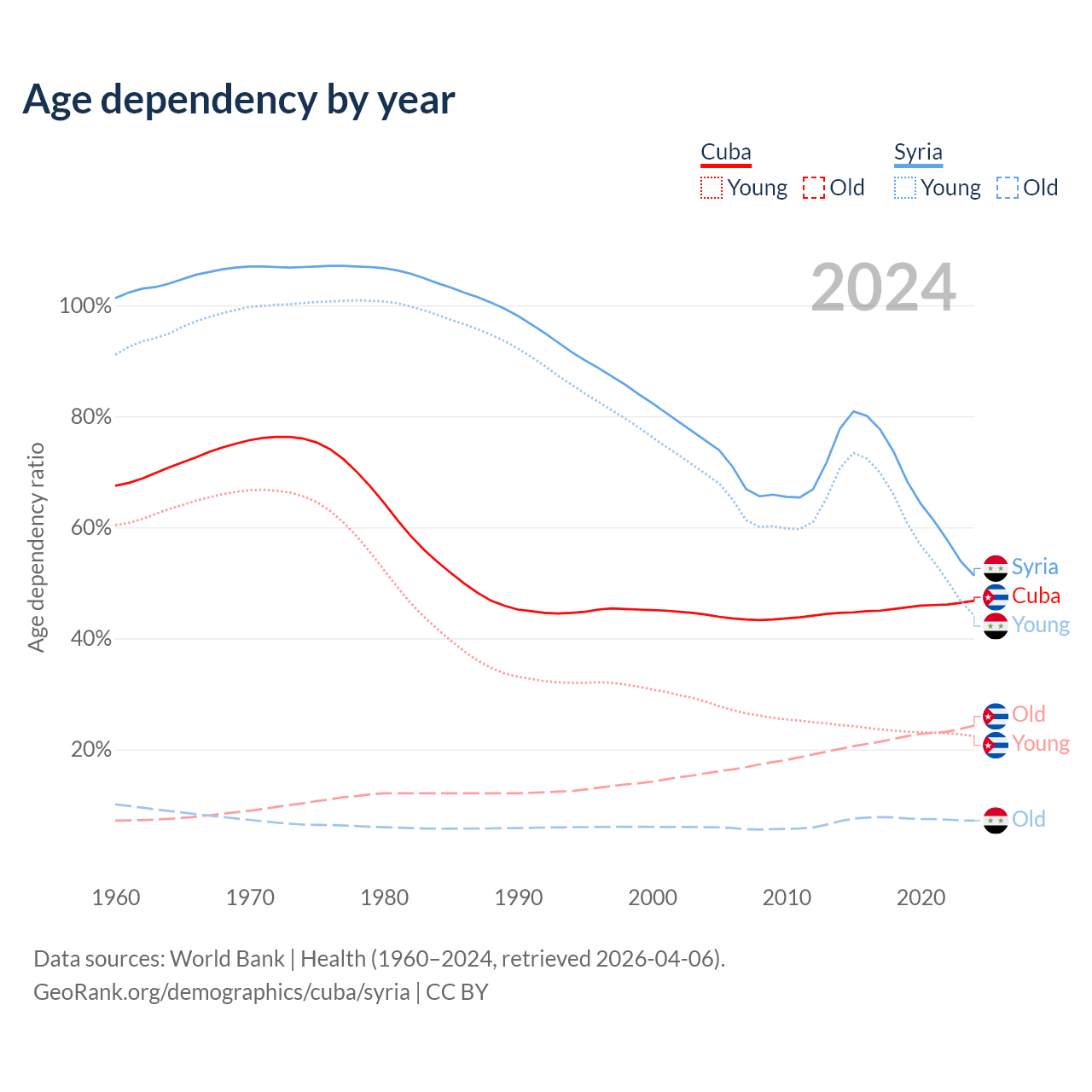 - The share of old-age demographic (65+) in Cuba is 16.6% vs 4.74% in Syria.