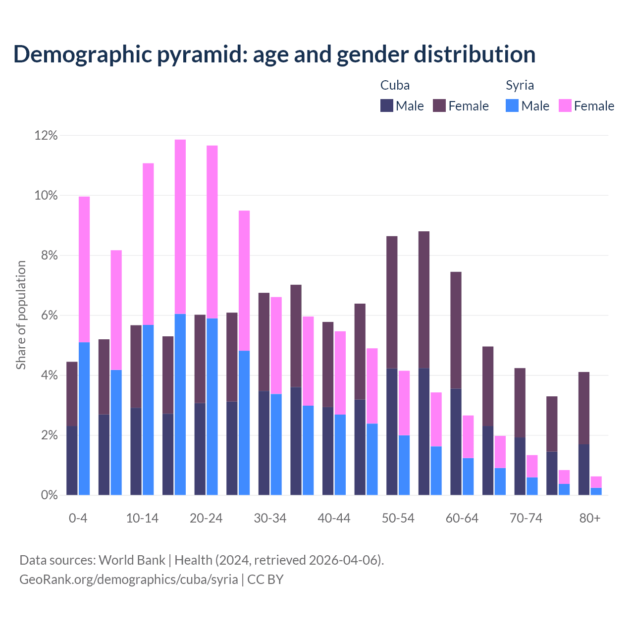 - Cuba is ranked 27/196 by median age (oldest to youngest) vs 138/196 for Syria.