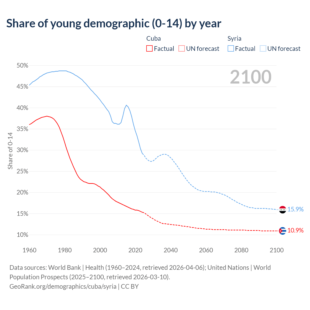 - The share of young demographic (0-15 years old) in Cuba is 15.3% vs 29.2% in Syria.