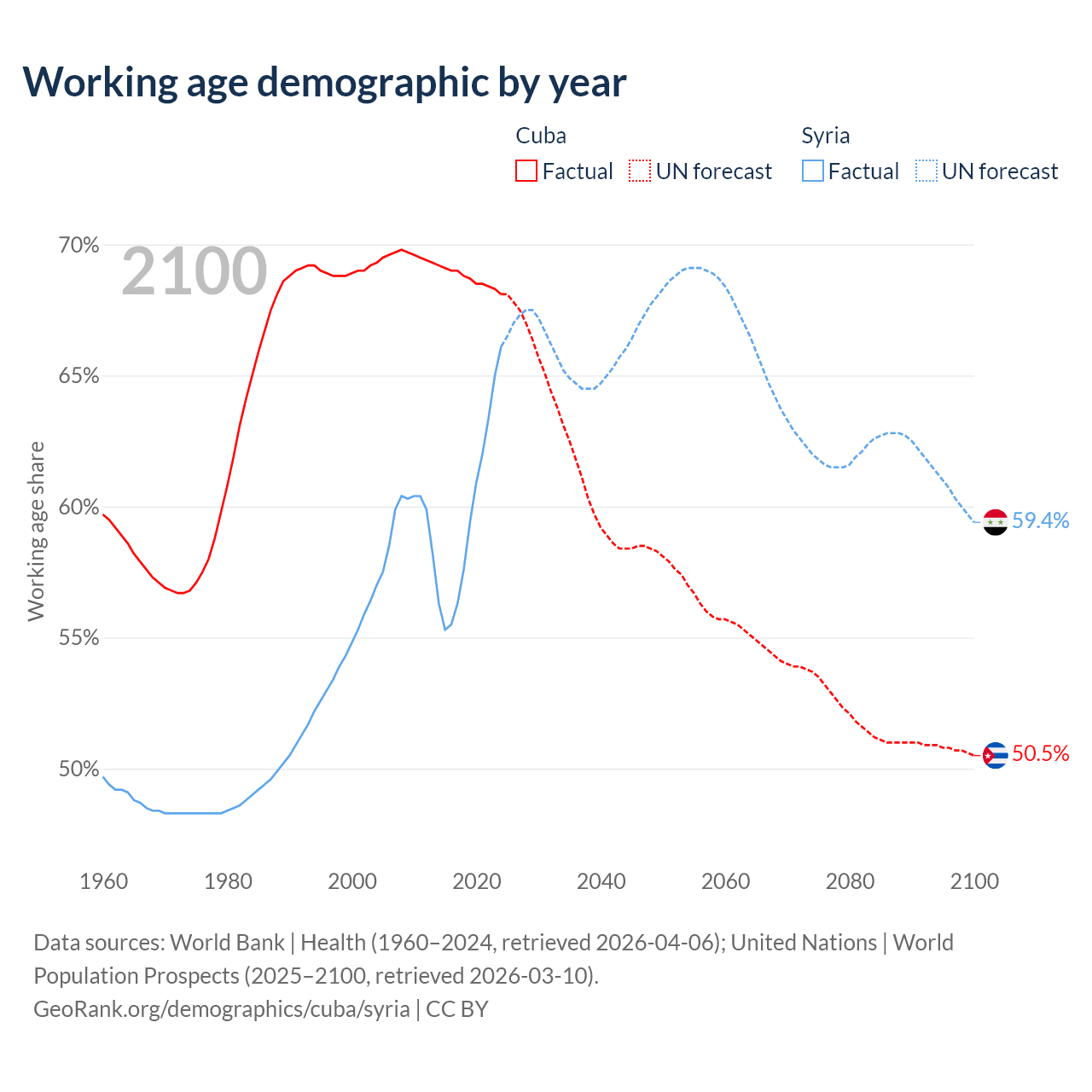 - Cuba has 7.42M working age adults (aged 15-64) vs 17.7M in Syria.