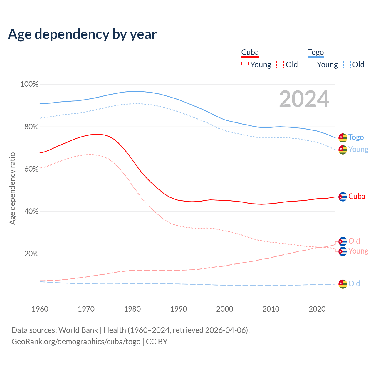 - Cuba is ranked 27/196 by median age (oldest to youngest) vs 166/196 for Togo.