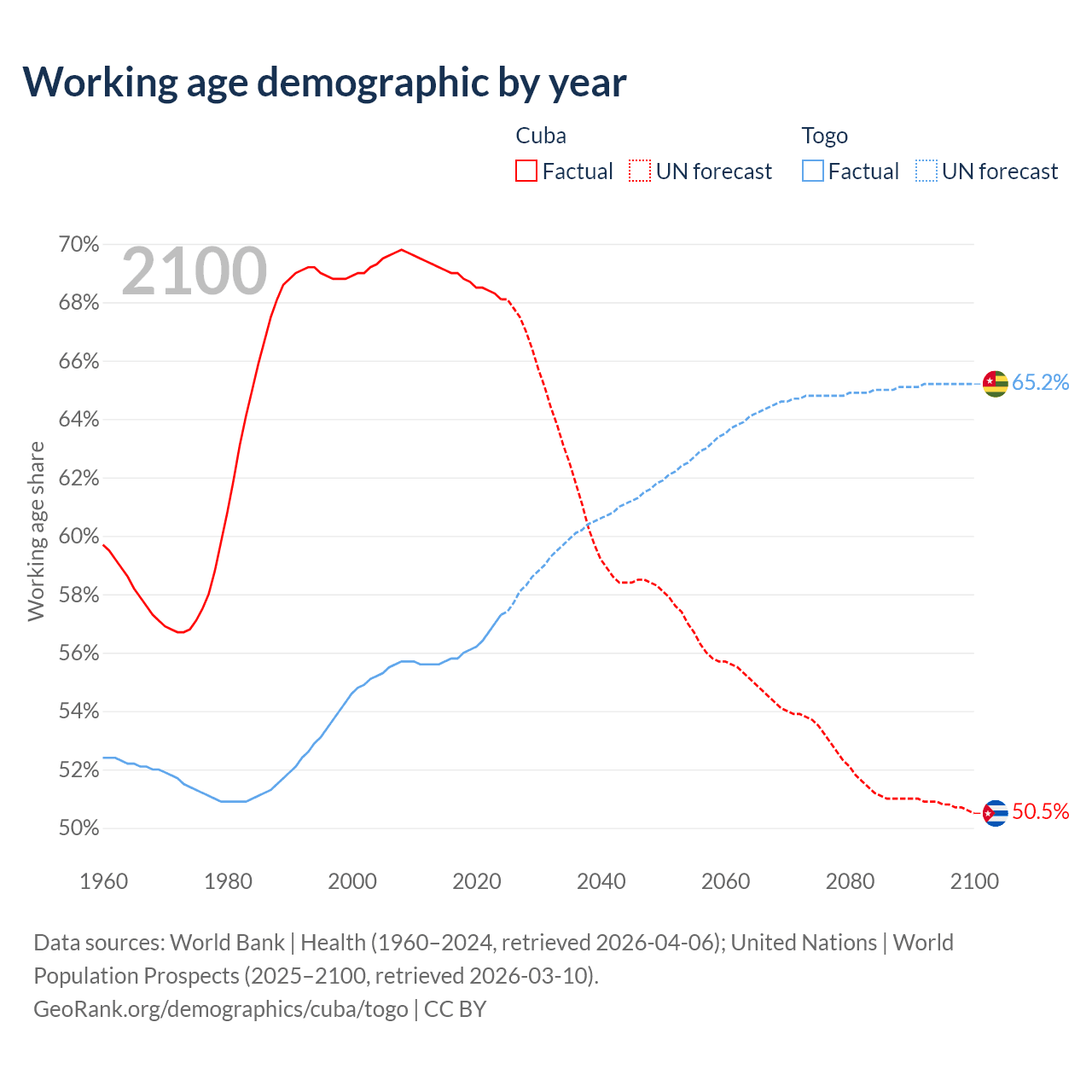 - Cuba has 7.42M working age adults (aged 15-64) vs 5.72M in Togo.