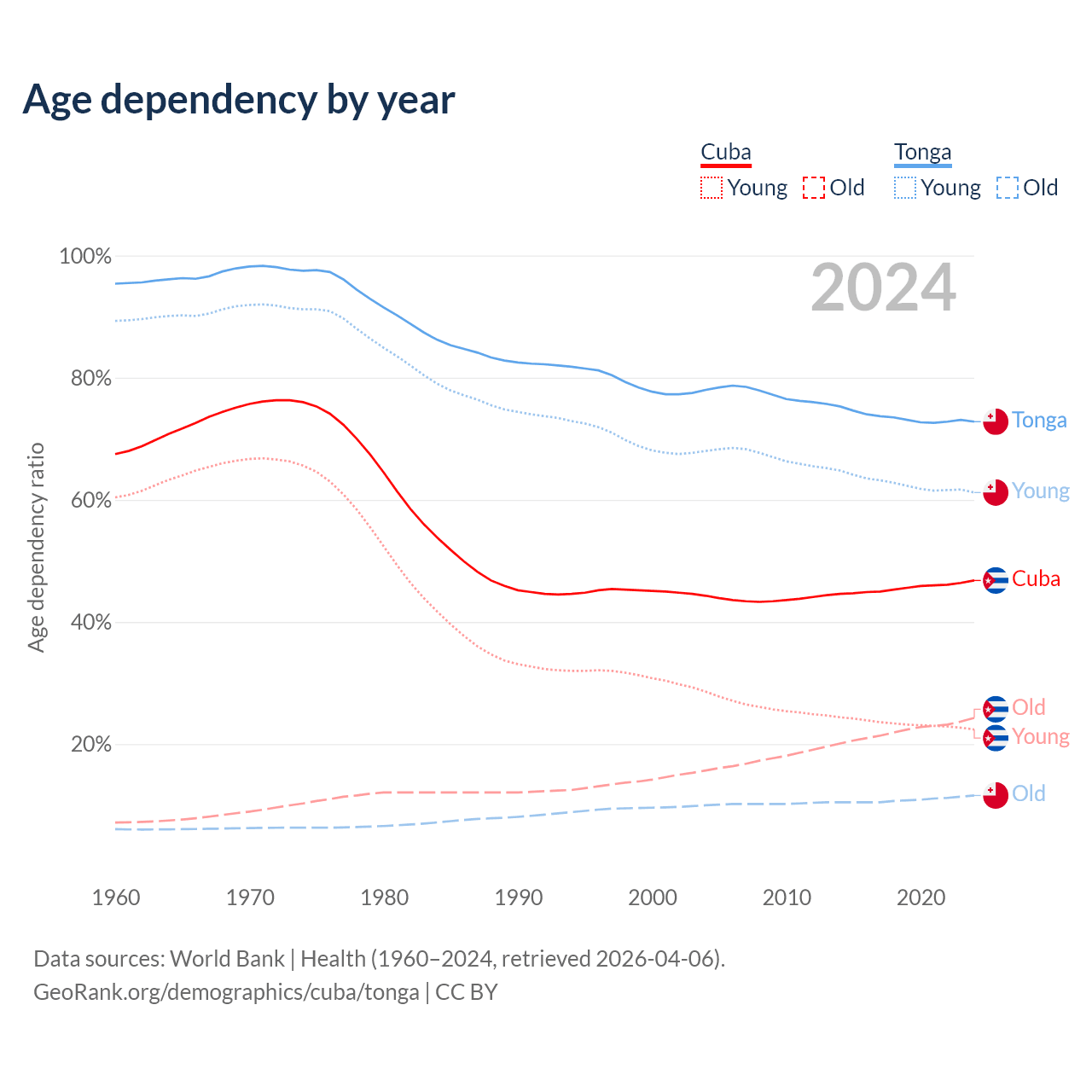 - The share of old-age demographic (65+) in Cuba is 16.6% vs 6.72% in Tonga.