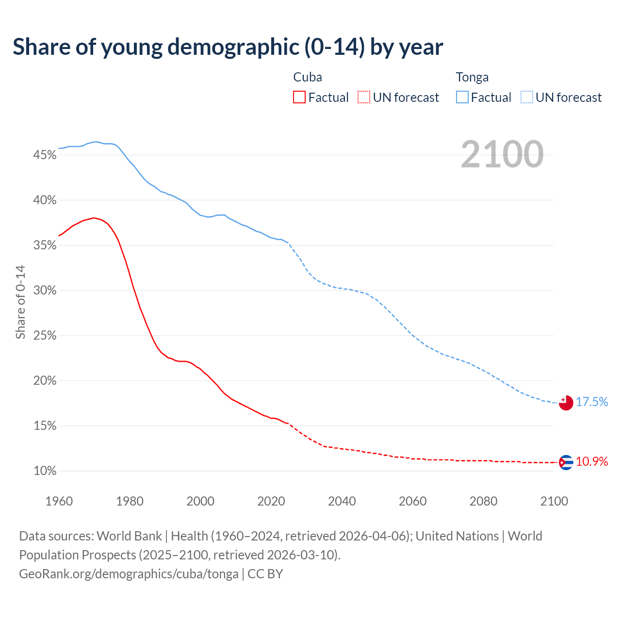 - The share of young demographic (0-15 years old) in Cuba is 15.3% vs 35.4% in Tonga.