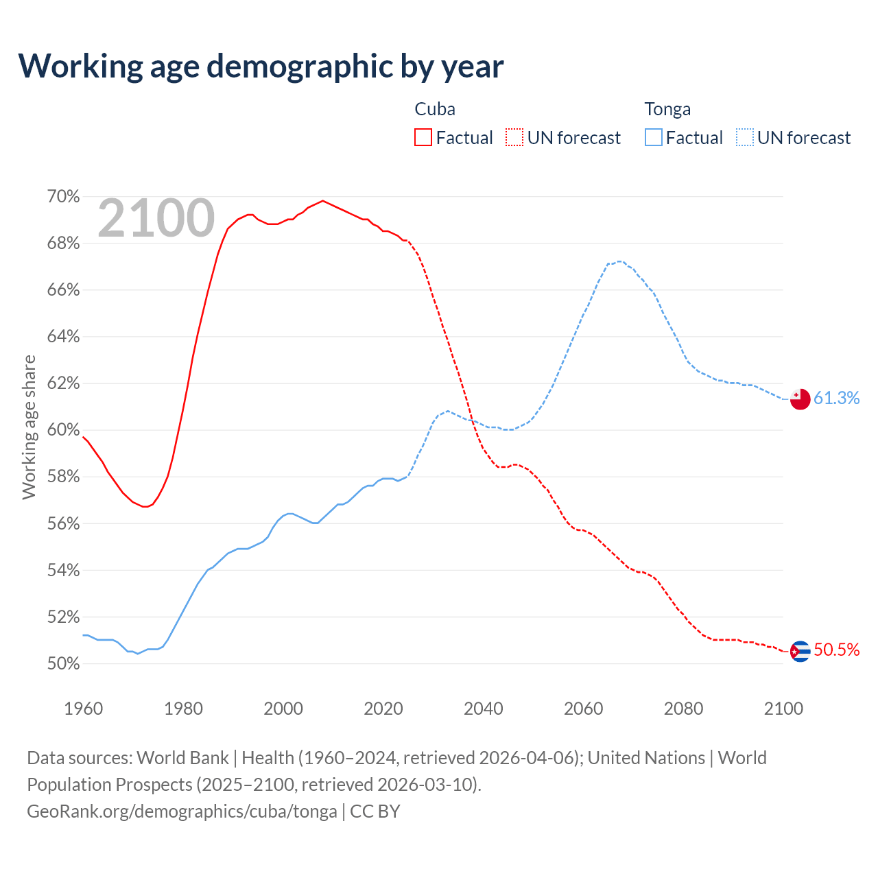 - Cuba has 7.42M working age adults (aged 15-64) vs 59.8K in Tonga.