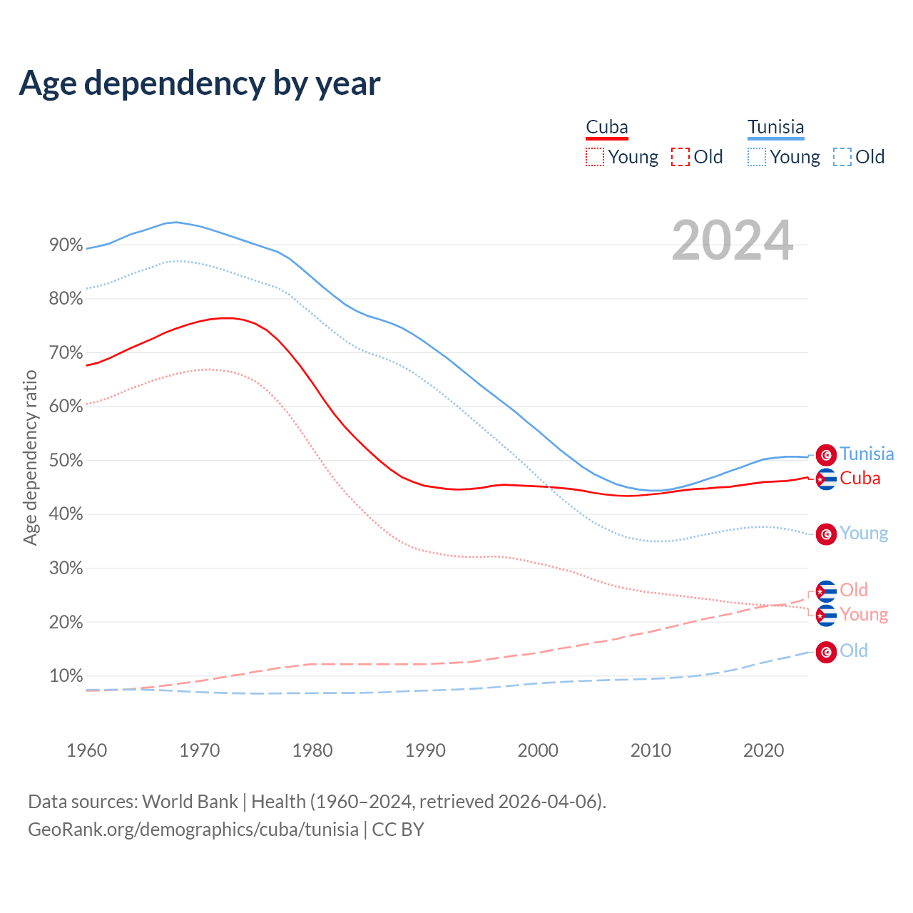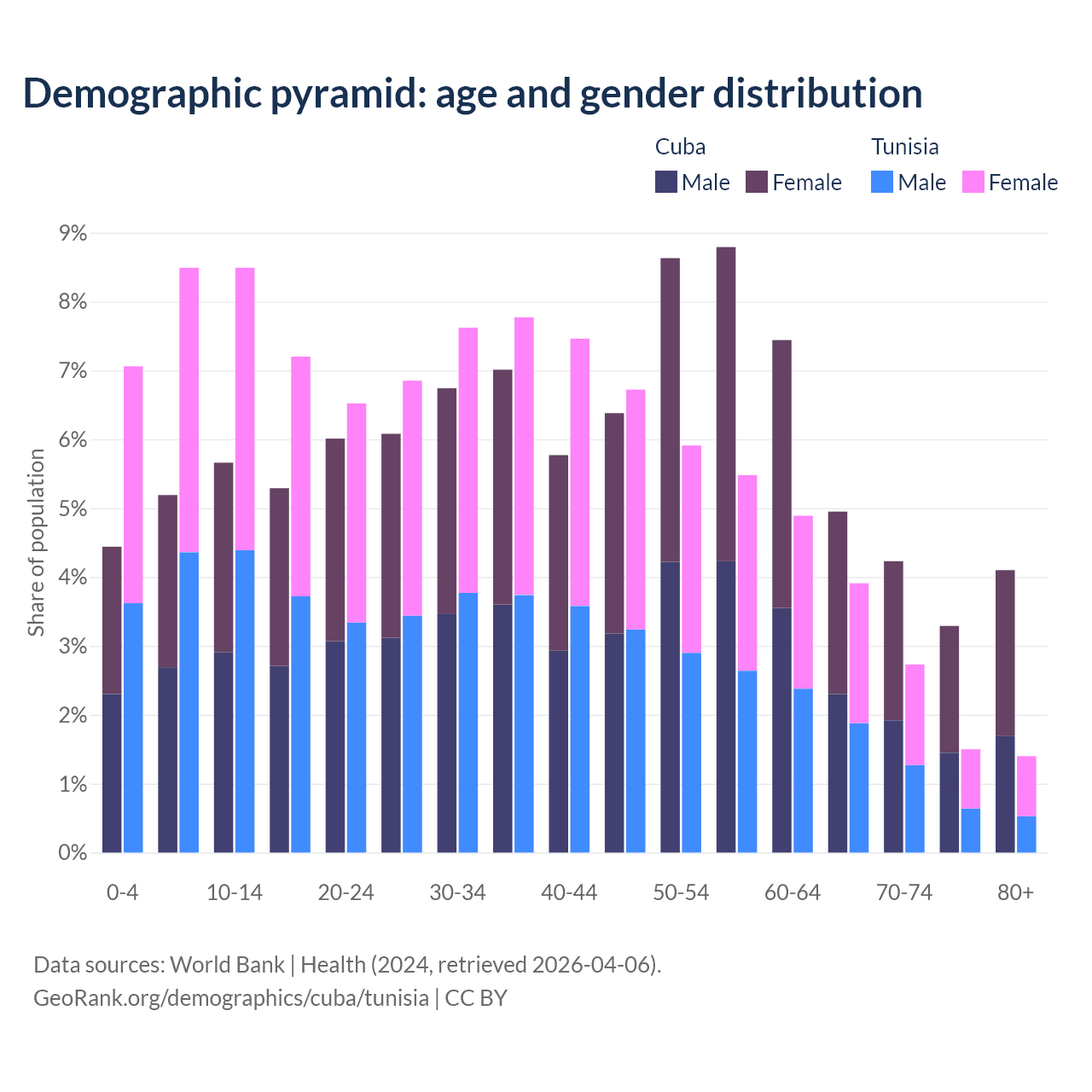 - Cuba is ranked 27/196 by median age (oldest to youngest) vs 86/196 for Tunisia.