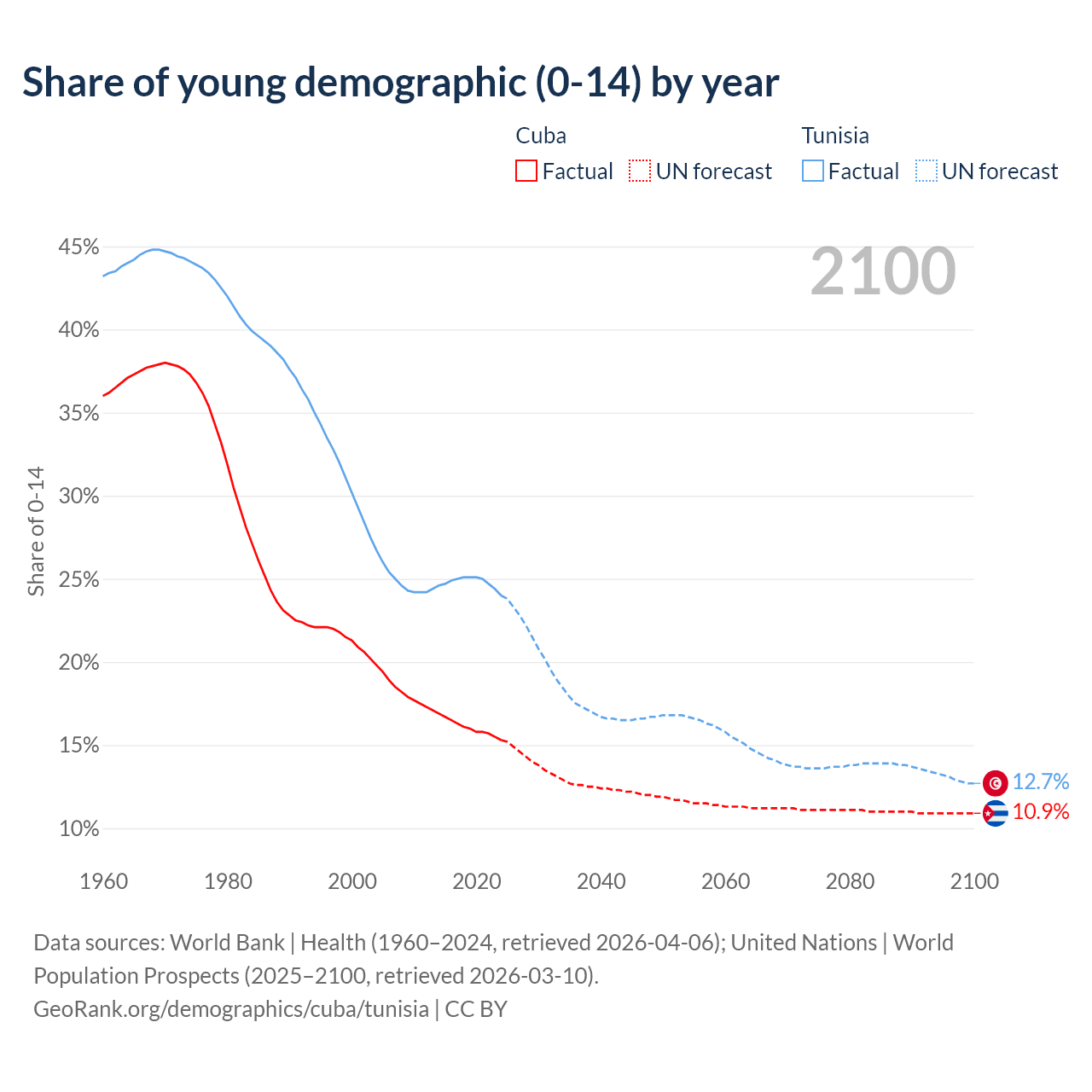 - The share of young demographic (0-15 years old) in Cuba is 15.3% vs 24% in Tunisia.