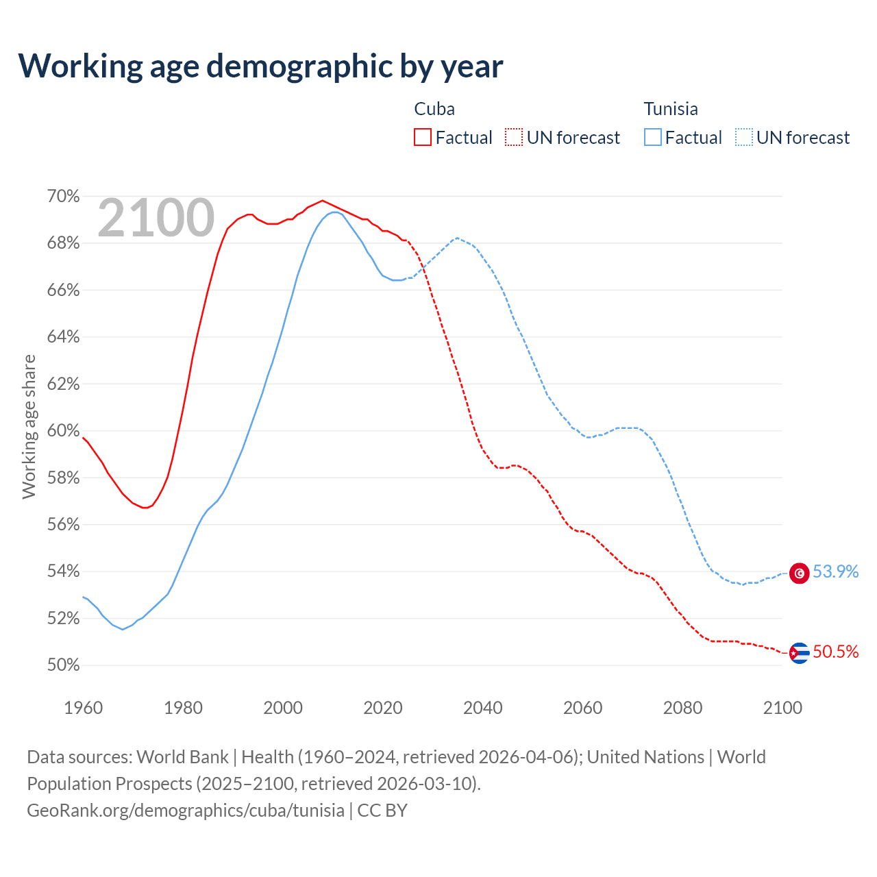 Median age Cuba vs Tunisia, 1960-2100