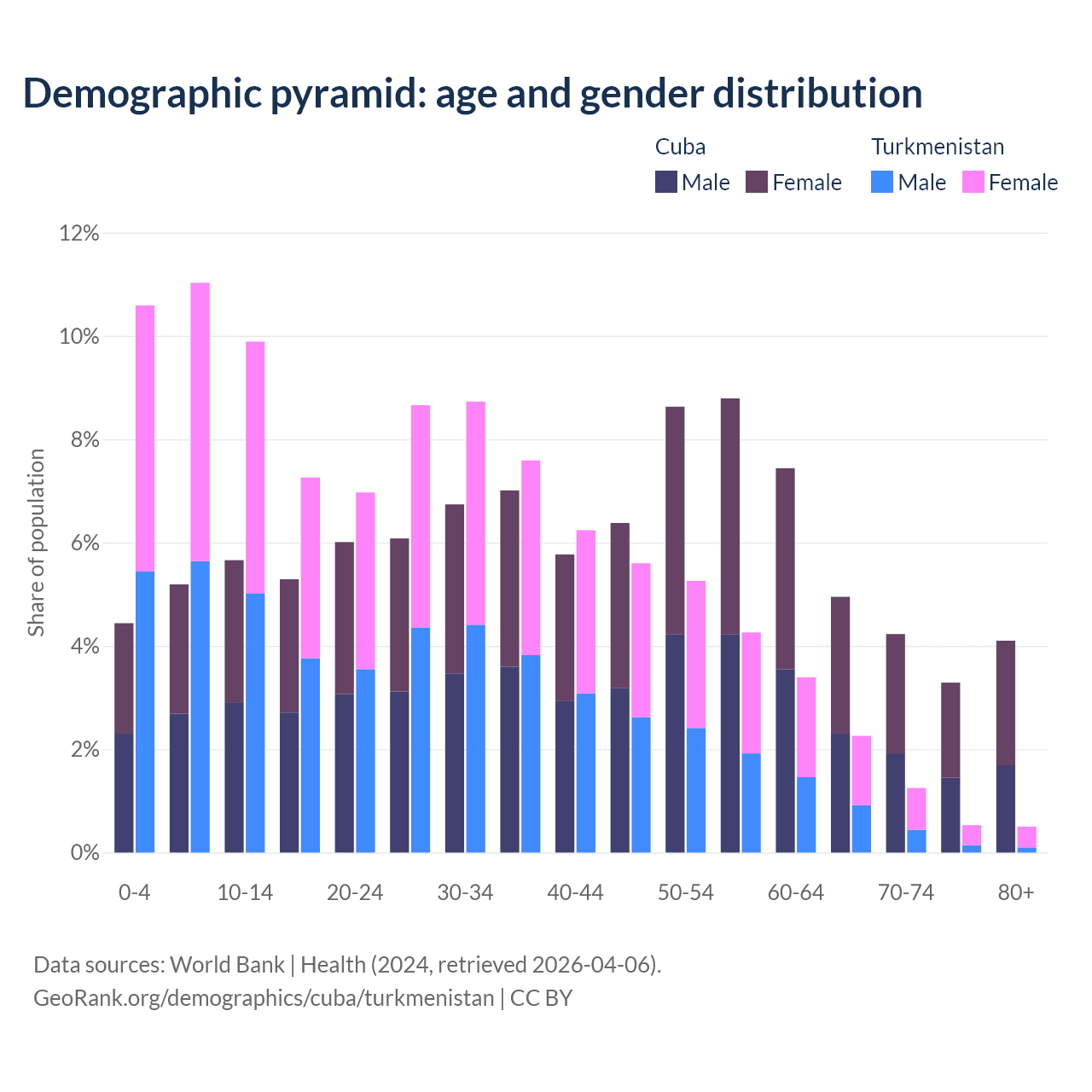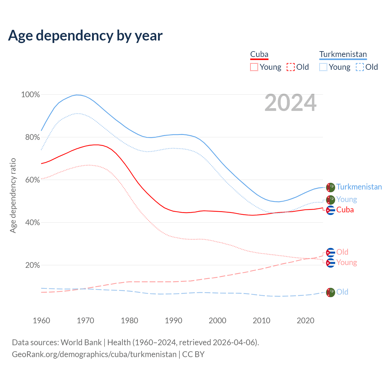 - Cuba is ranked 27/196 by median age (oldest to youngest) vs 119/196 for Turkmenistan.