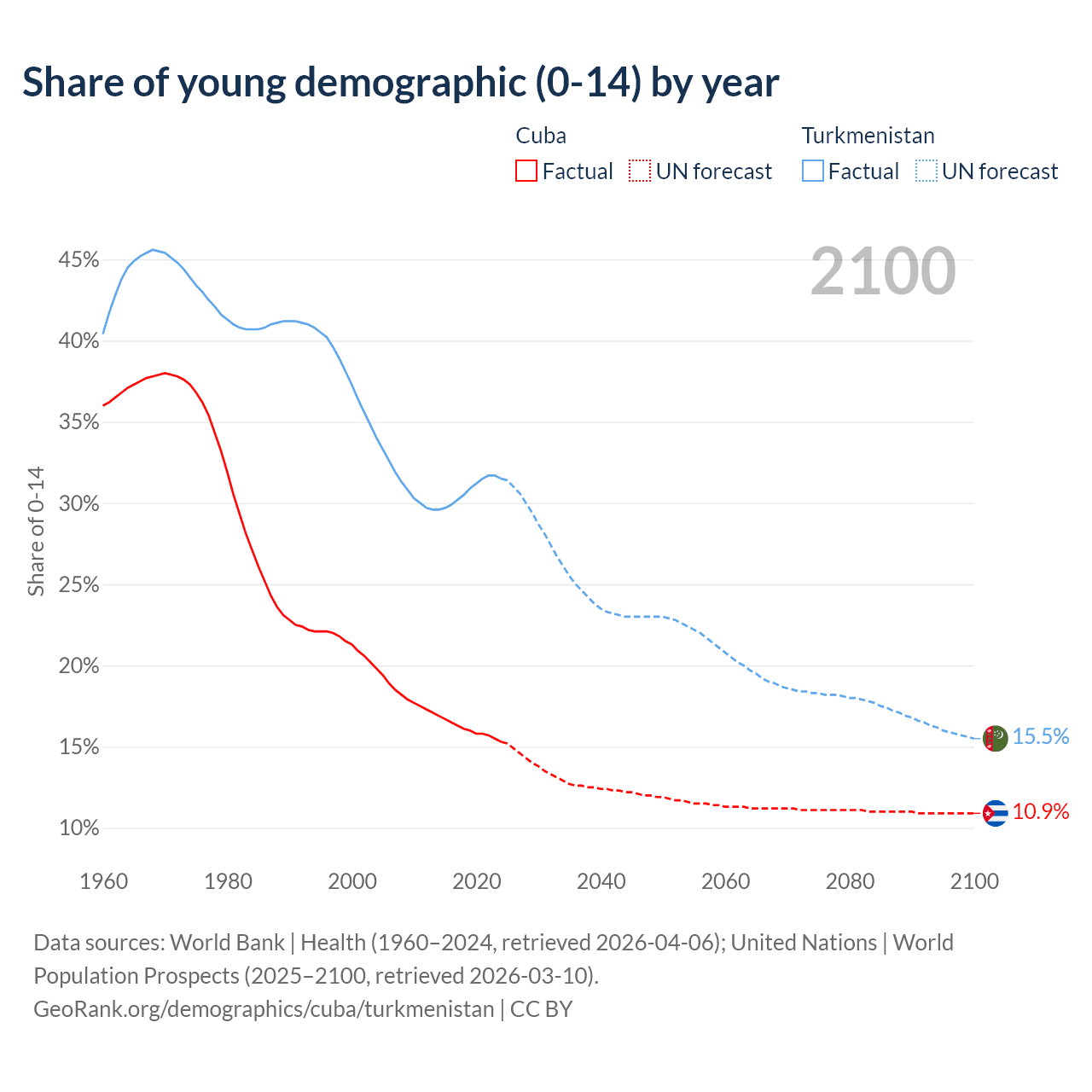 - The share of young demographic (0-15 years old) in Cuba is 15.3% vs 31.5% in Turkmenistan.