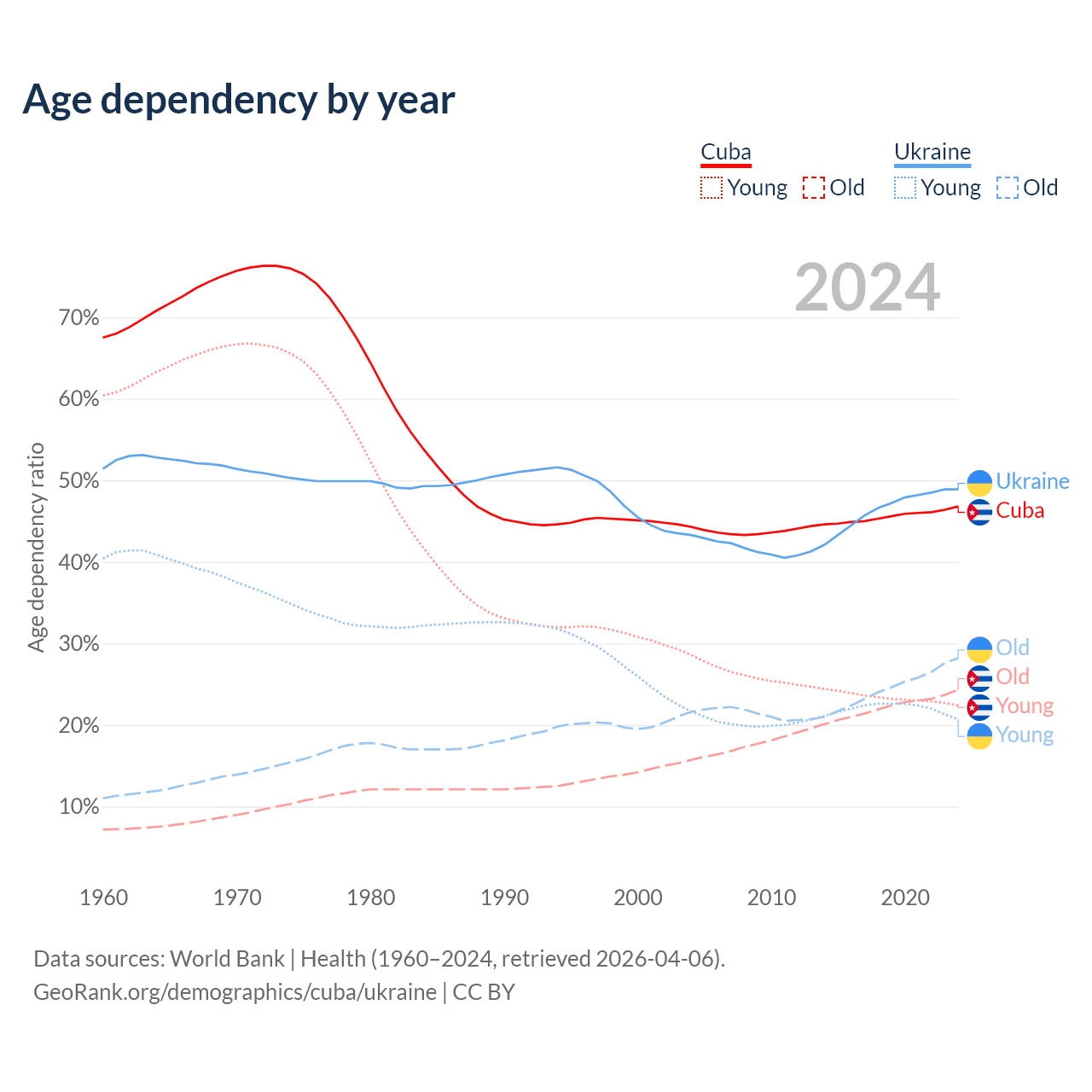 Data sources: World Bank | Health (1960–2024, retrieved 2026-04-06); U.S. Census Bureau (1960–2024, retrieved 2026-02-08).