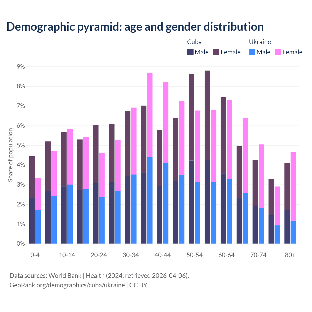 - Cuba is ranked 27/196 by median age (oldest to youngest) vs 26/196 for Ukraine.