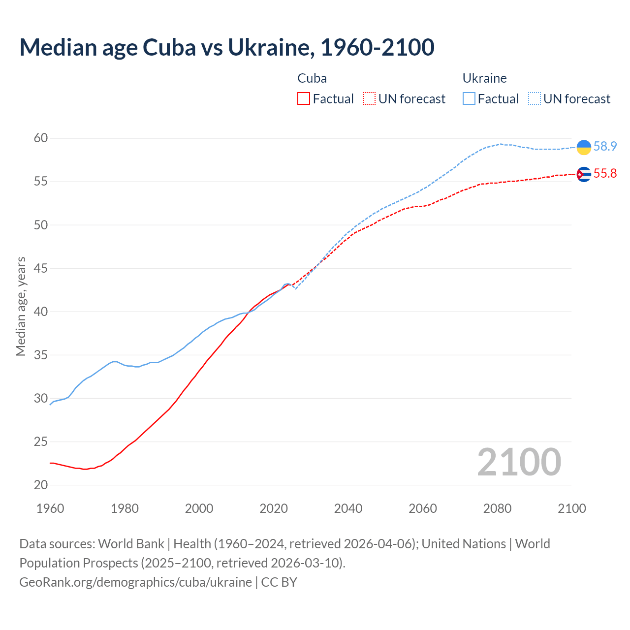 Median age Cuba vs Ukraine, 1960-2100