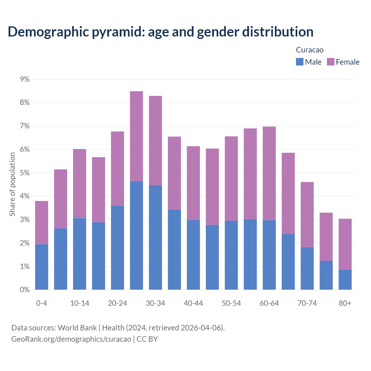 With a population of 156K people, Curacao has a median age of 39.5 years which makes it the 49/196 oldest country. 14.9% of the demographic are children 0-14 years old, 68.3% are working-age people aged 15-64, and 16.8% are older population aged 65+ years.