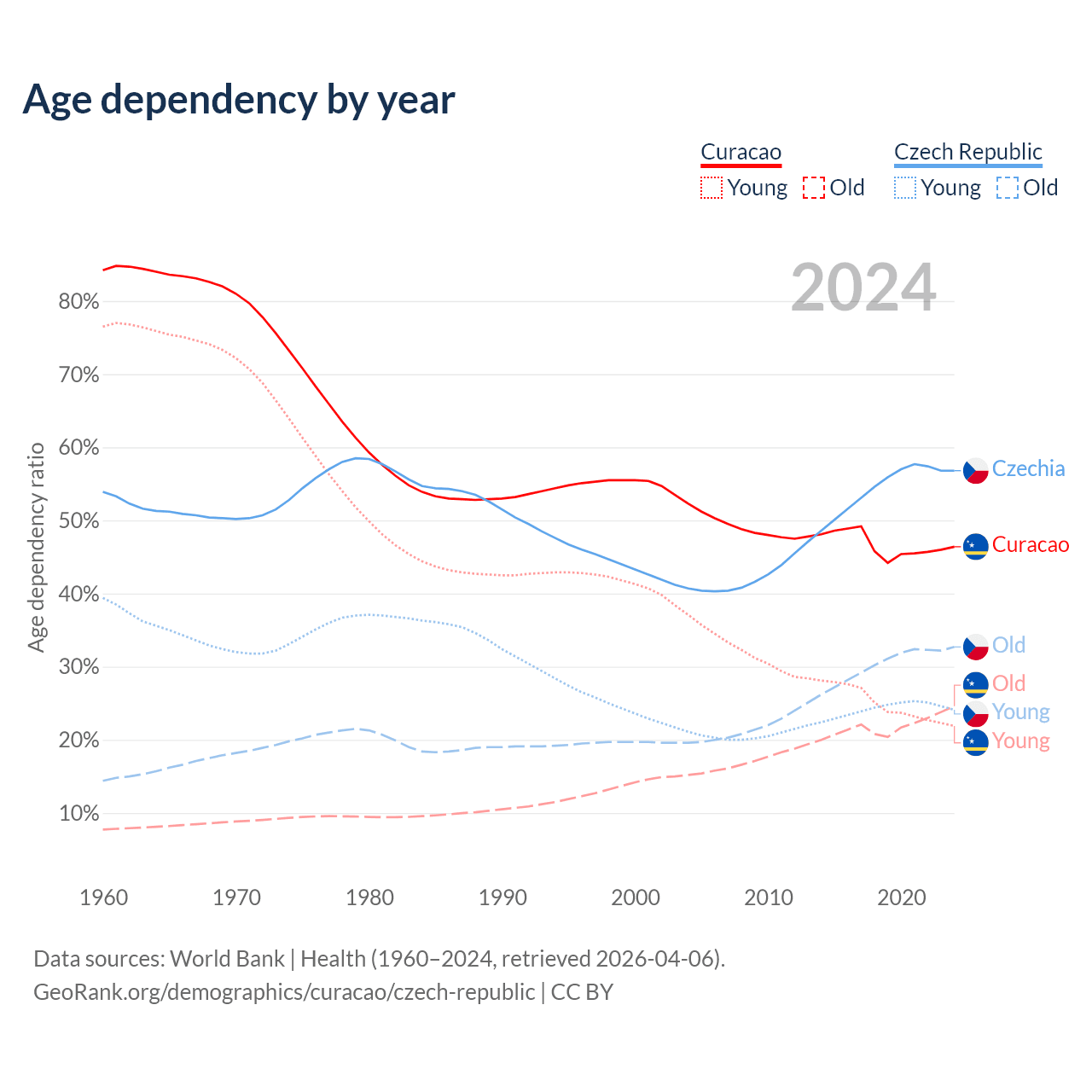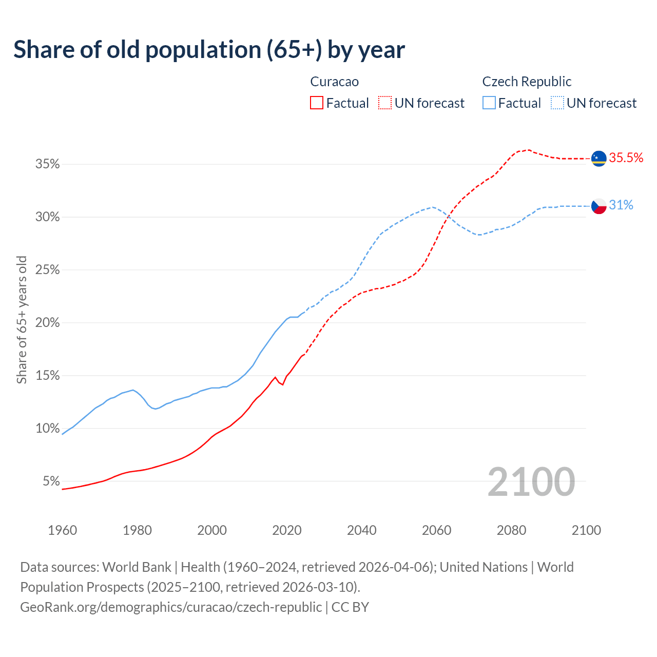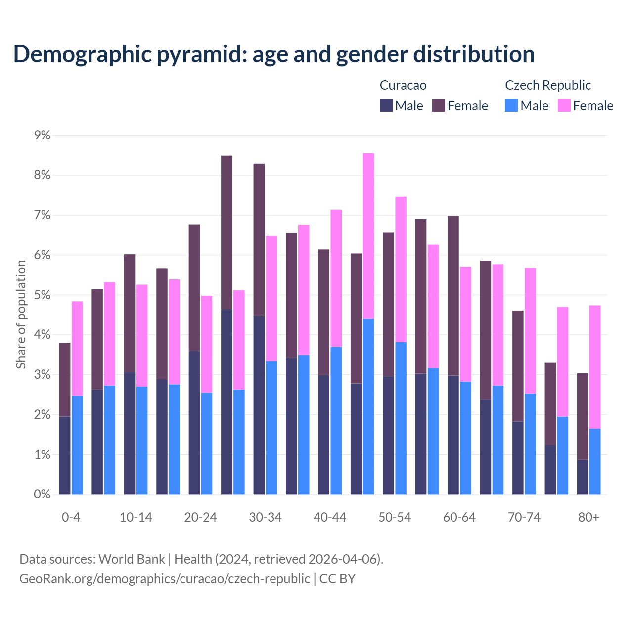 - The share of old-age demographic (65+) in Curacao is 16.8% vs 20.8% in the Czech Republic.