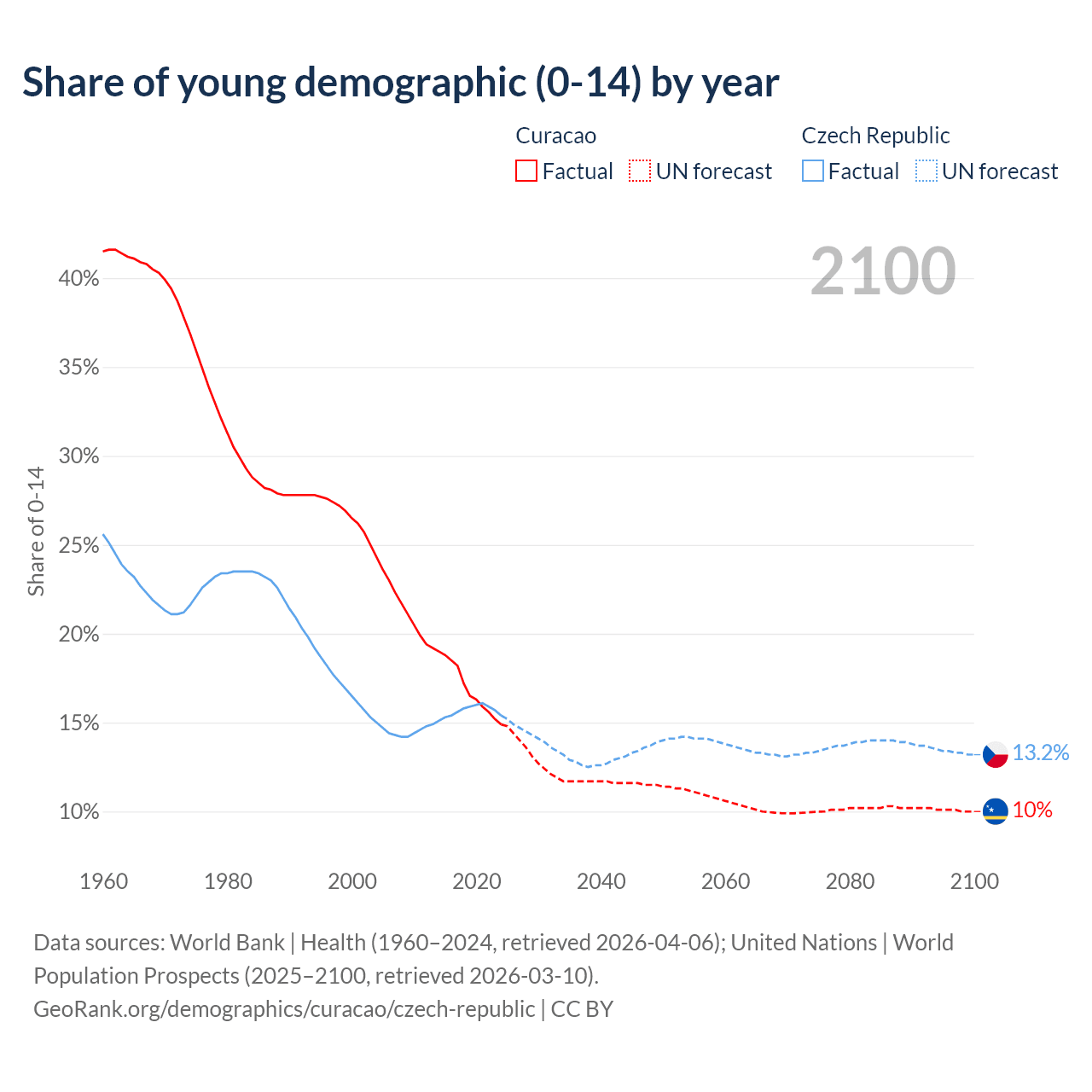 - The share of young demographic (0-15 years old) in Curacao is 14.9% vs 15.4% in the Czech Republic.