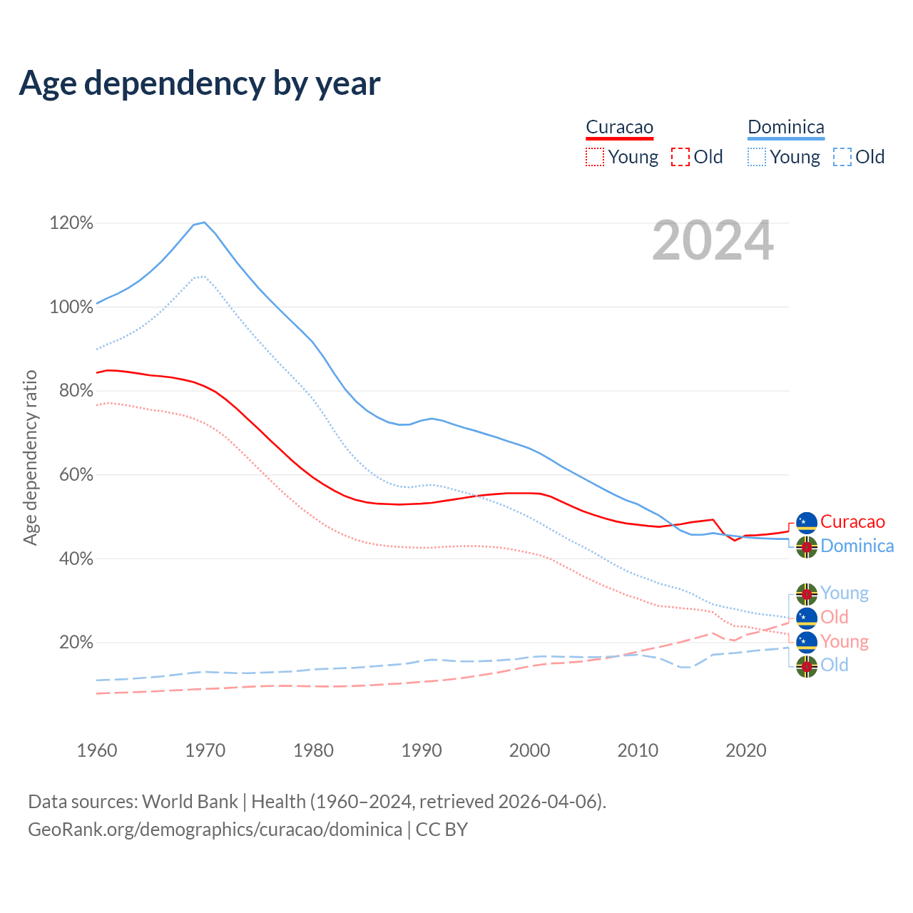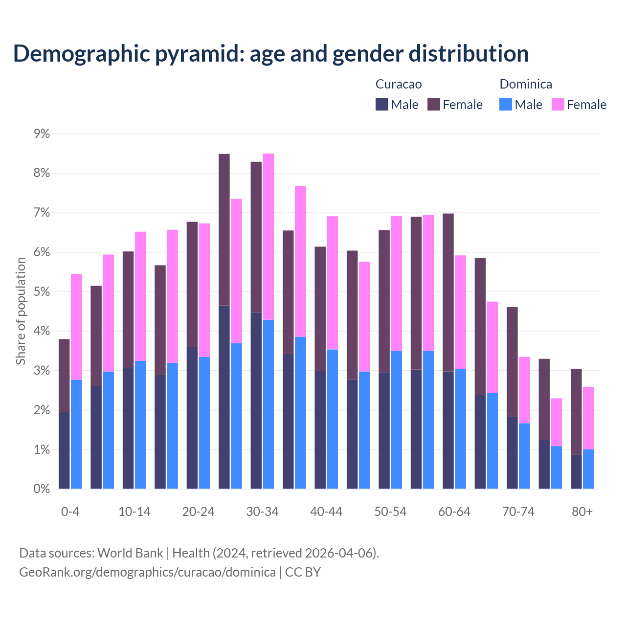 - Curacao is ranked 49/196 by median age (oldest to youngest) vs 66/196 for Dominica.