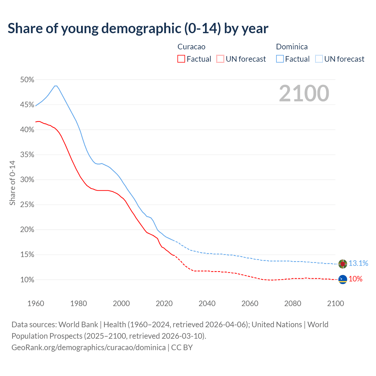 - The share of young demographic (0-15 years old) in Curacao is 14.9% vs 17.9% in Dominica.
