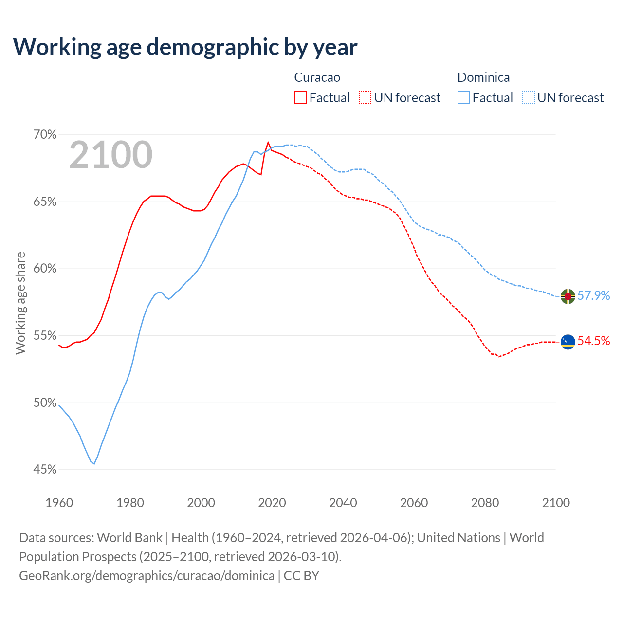 - Curacao has 107K working age adults (aged 15-64) vs 45.3K in Dominica.