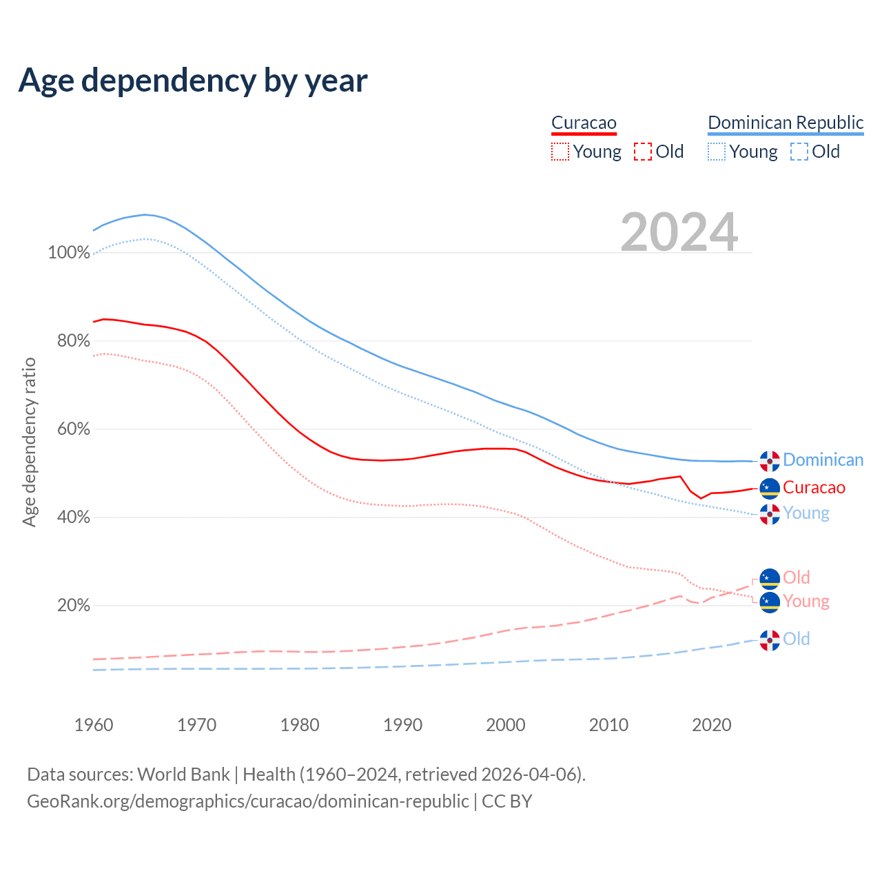 - Curacao is ranked 49/196 by median age (oldest to youngest) vs 112/196 for the Dominican Republic.