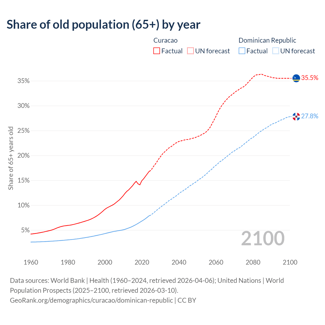 The share of older people aged 65 and over is 16.8% in Curacao and 7.88% in the Dominican Republic. Life expectancy in Curacao compared to the Dominican Republic .