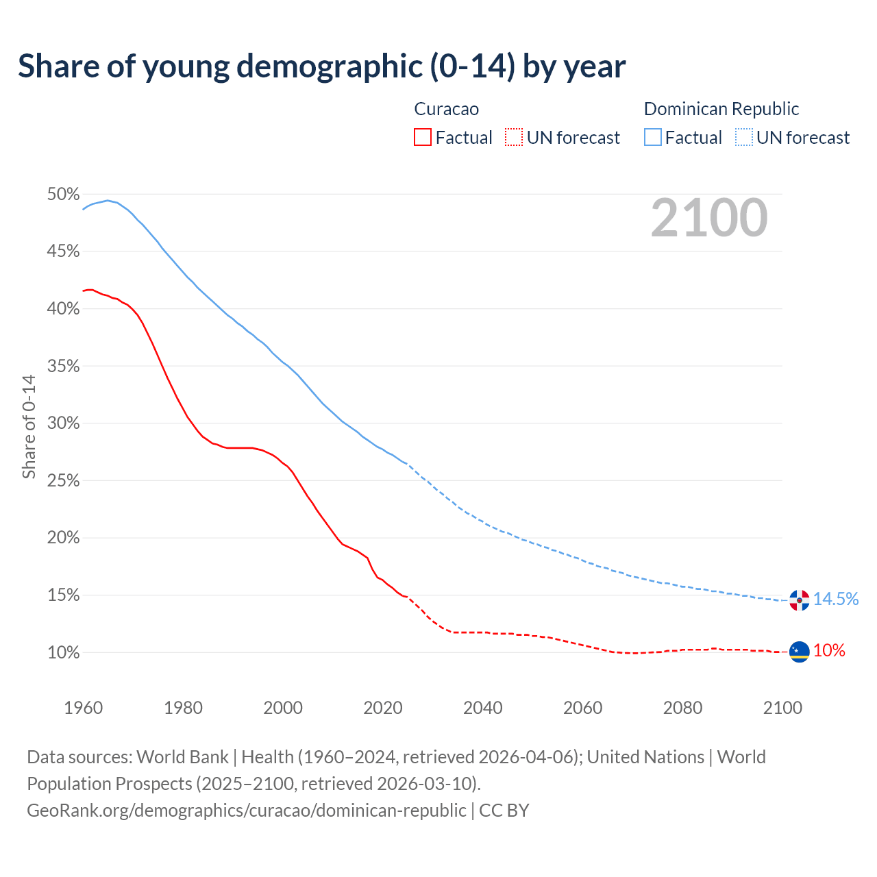 - The share of young demographic (0-15 years old) in Curacao is 14.9% vs 26.6% in the Dominican Republic.