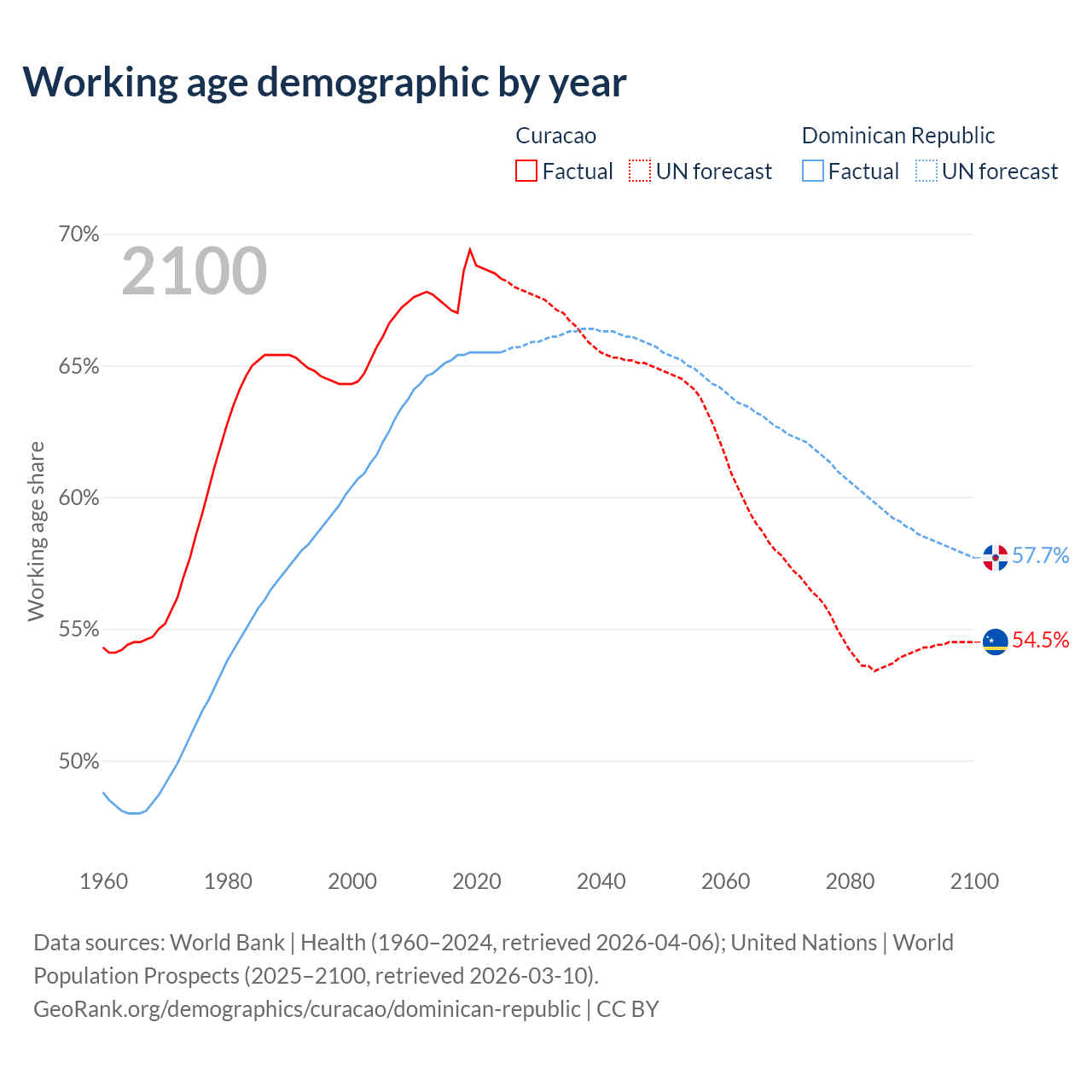 - Curacao has 107K working age adults (aged 15-64) vs 7.63M in the Dominican Republic.