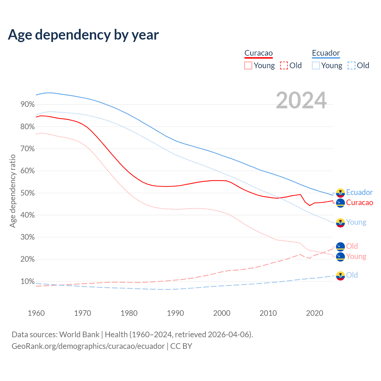 - Curacao is ranked 49/196 by median age (oldest to youngest) vs 105/196 for Ecuador.