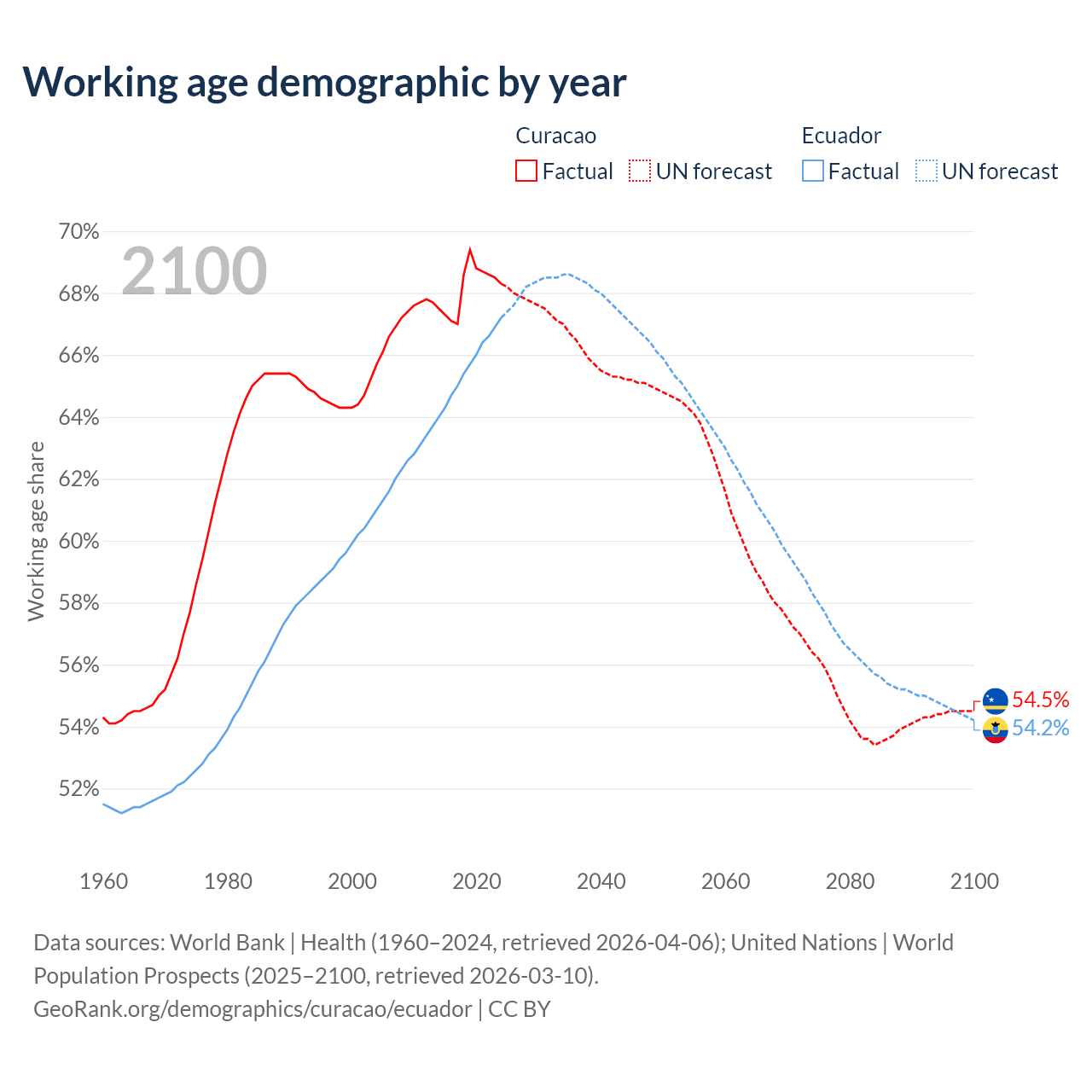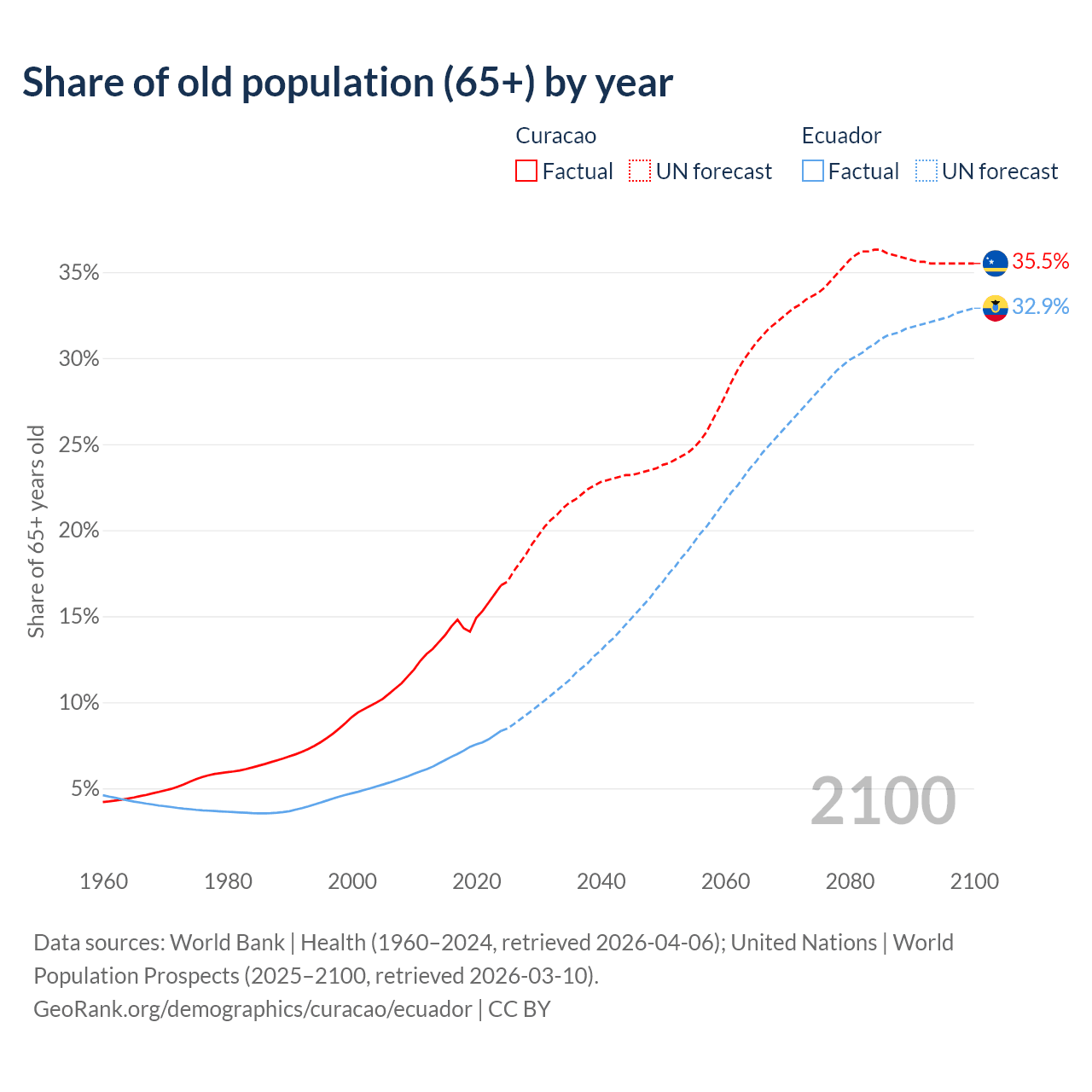 - The share of old-age demographic (65+) in Curacao is 16.8% vs 8.34% in Ecuador.
