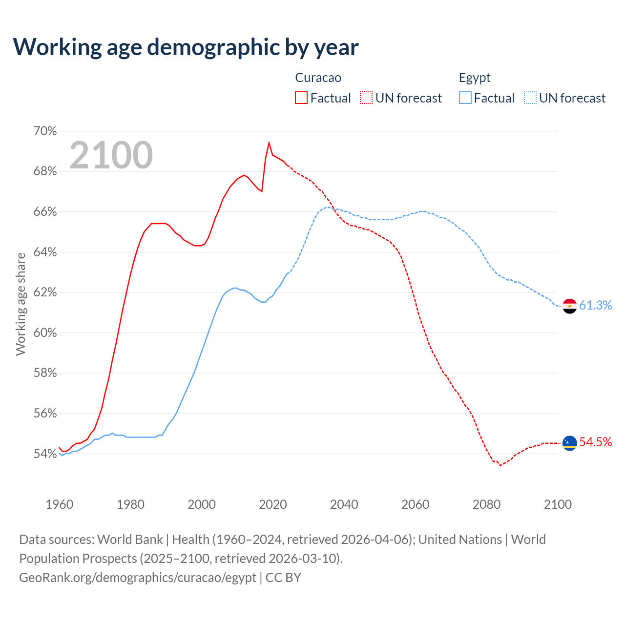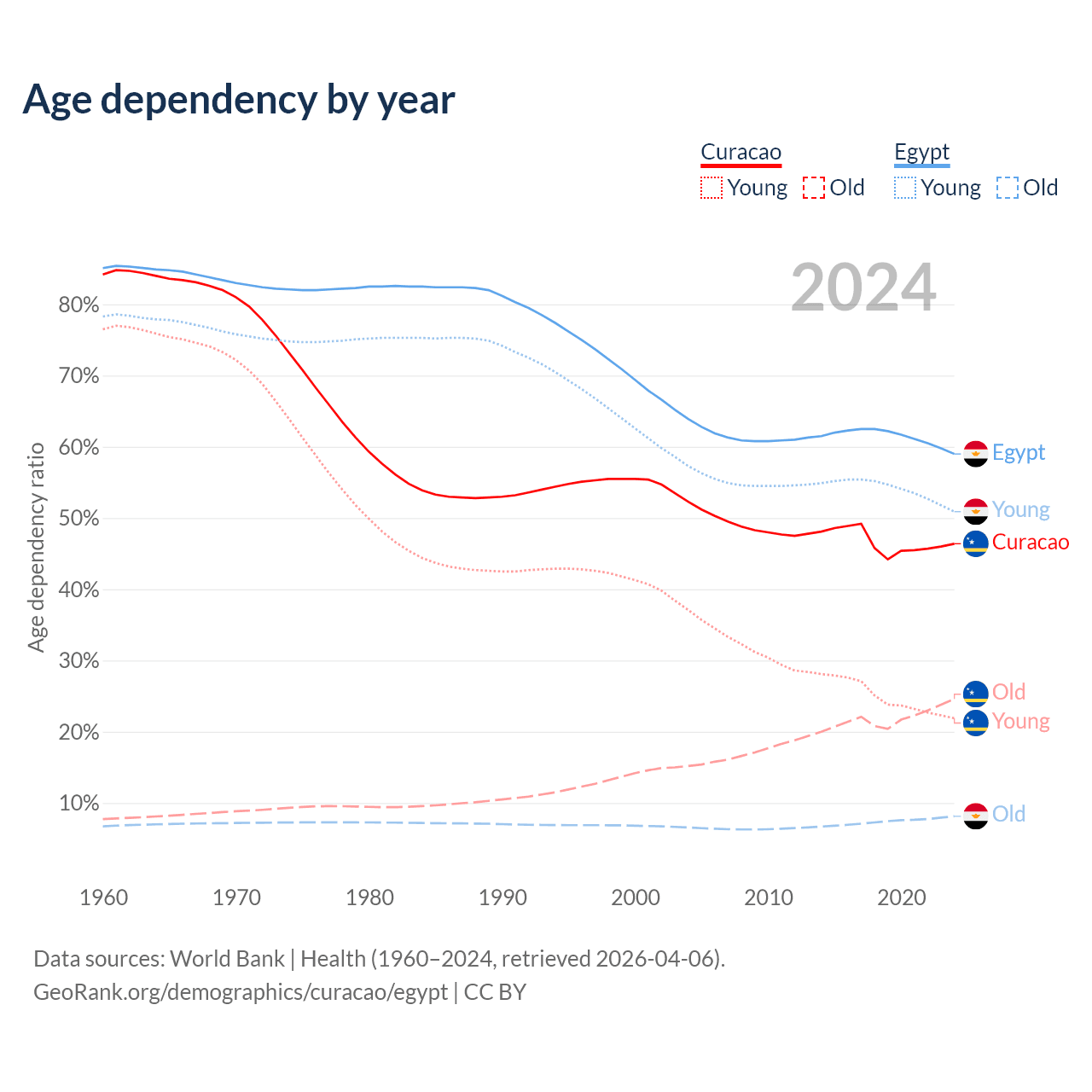 - The share of old-age demographic (65+) in Curacao is 16.8% vs 5.12% in Egypt.