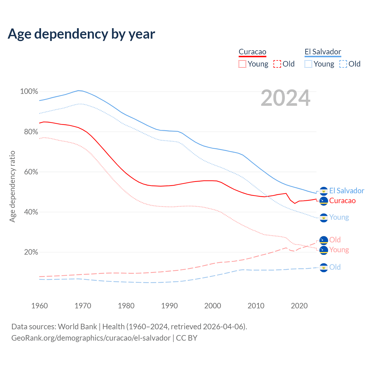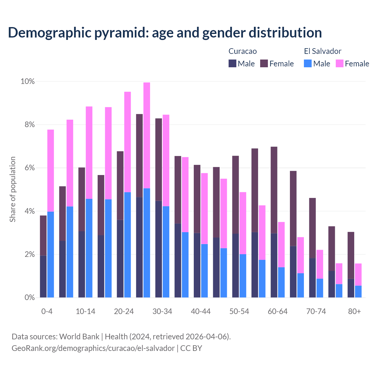 - Curacao is ranked 49/196 by median age (oldest to youngest) vs 115/196 for El Salvador.