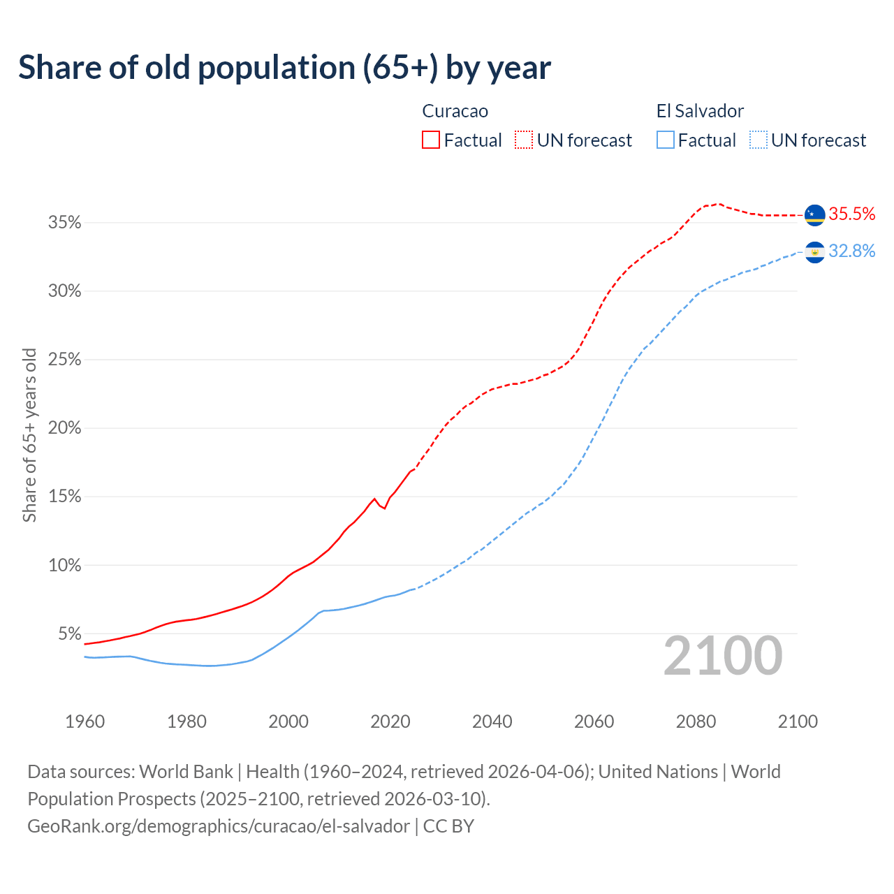 - The share of old-age demographic (65+) in Curacao is 16.8% vs 8.15% in El Salvador.