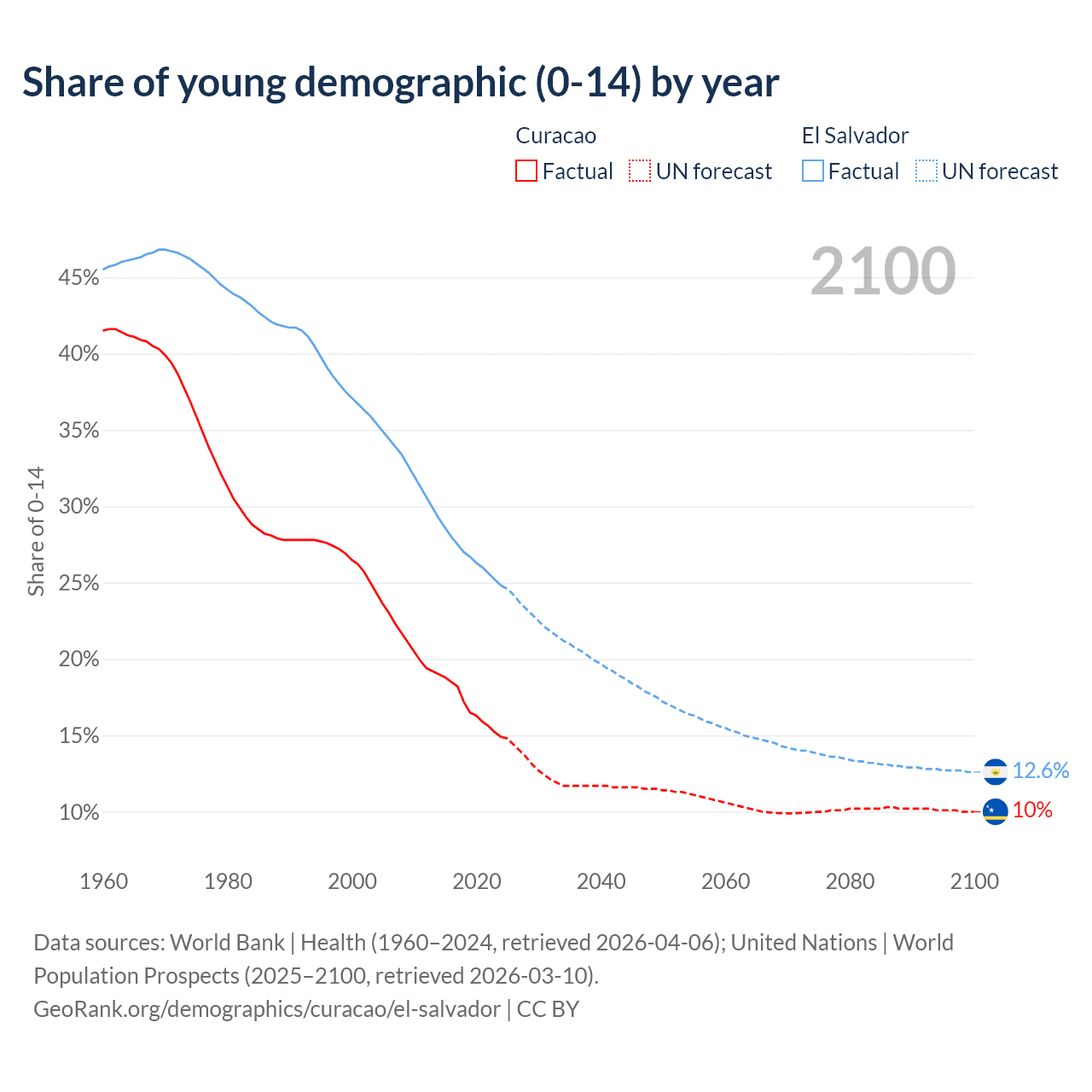 - The share of young demographic (0-15 years old) in Curacao is 14.9% vs 24.8% in El Salvador.