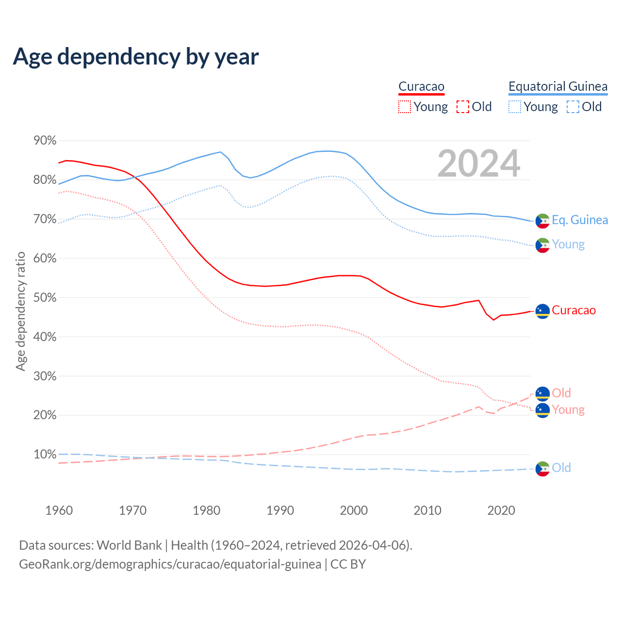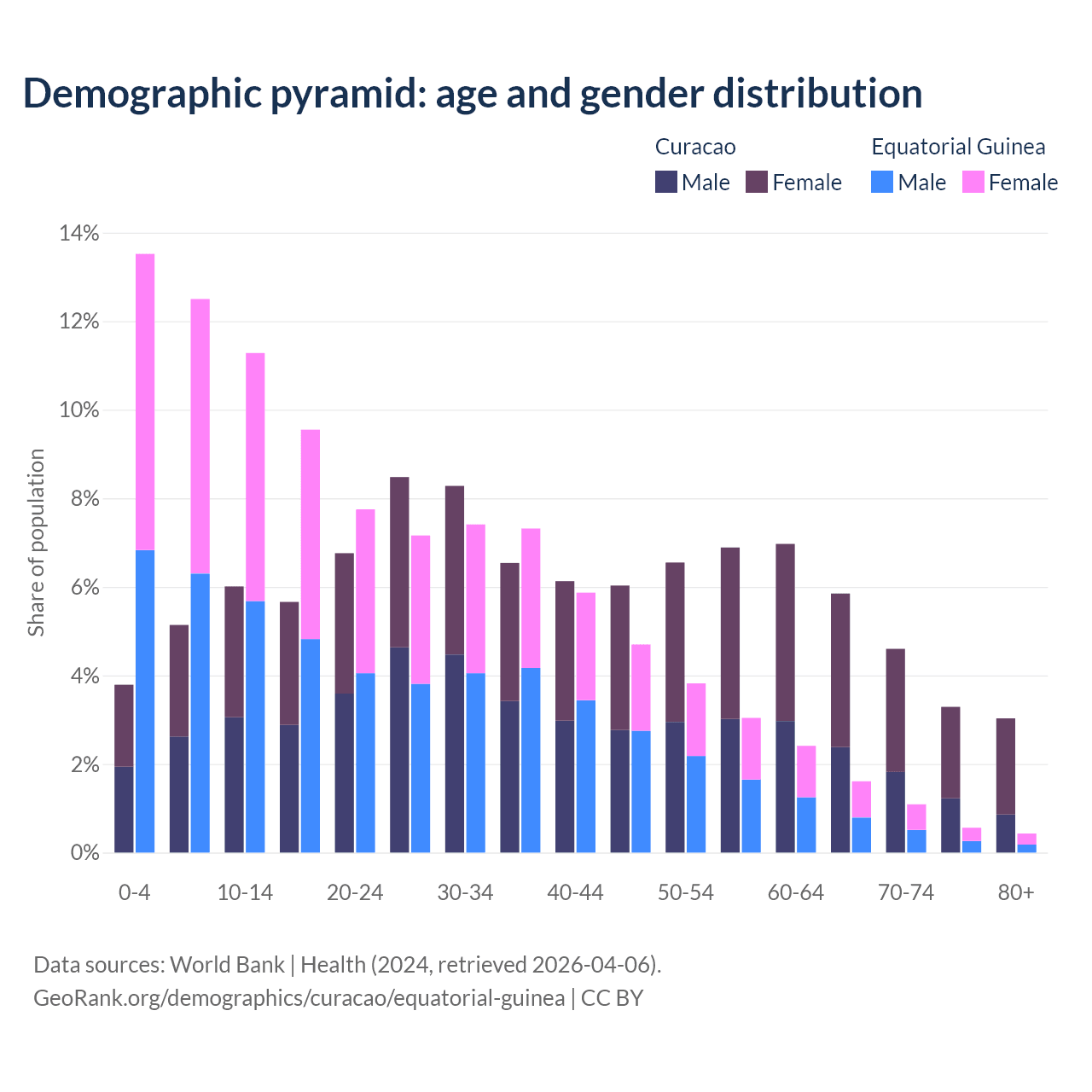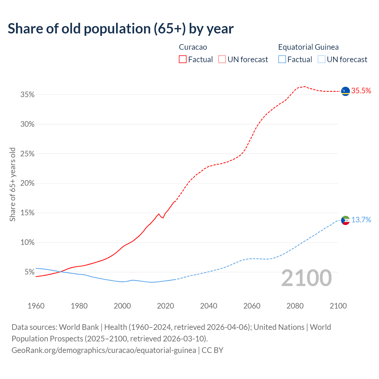 - The share of old-age demographic (65+) in Curacao is 16.8% vs 3.69% in Equatorial Guinea.