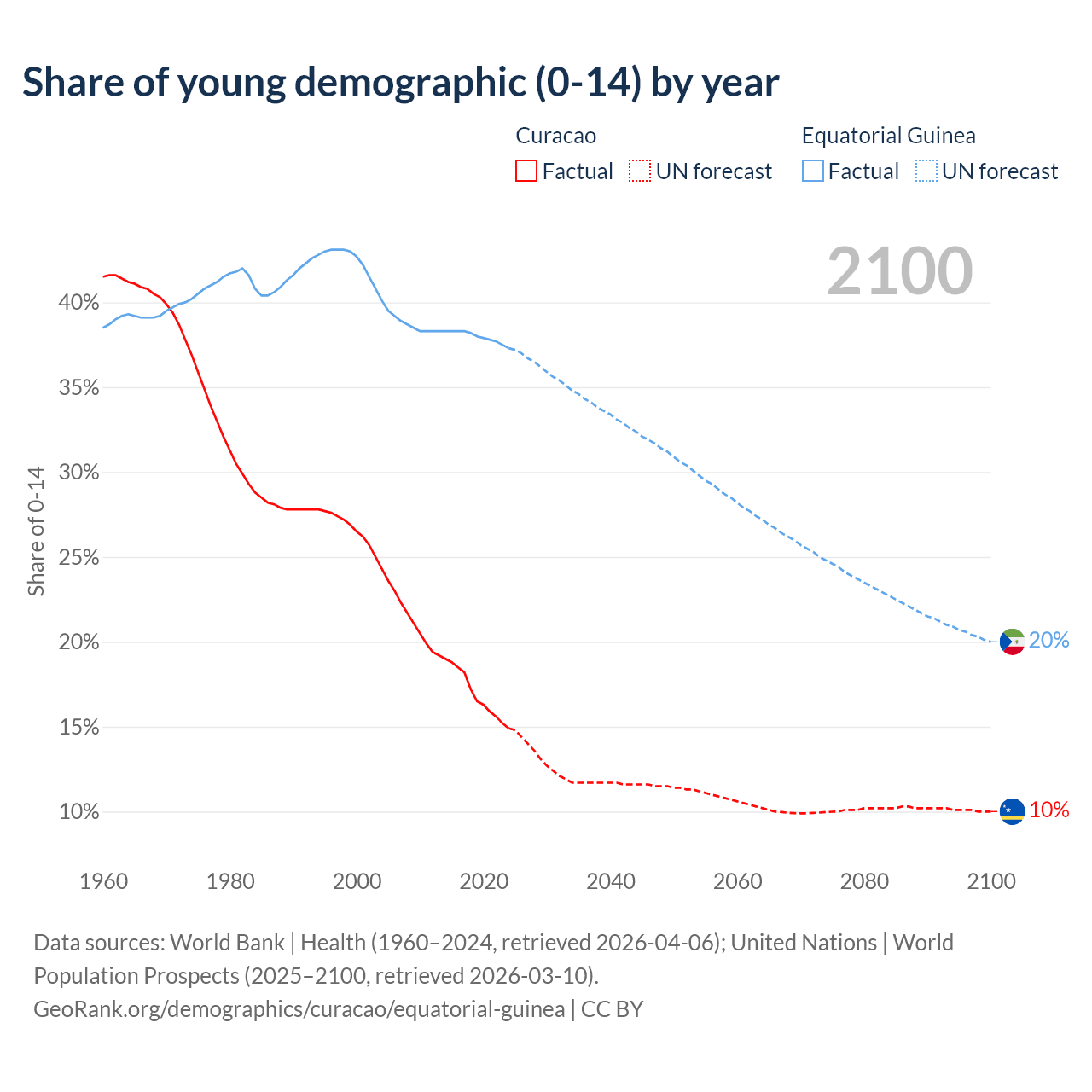 - The share of young demographic (0-15 years old) in Curacao is 14.9% vs 37.3% in Equatorial Guinea.