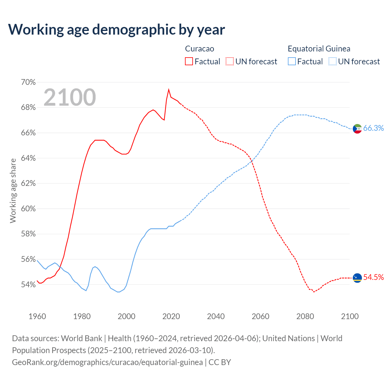 Median age Curacao vs Equatorial Guinea, 1960-2100