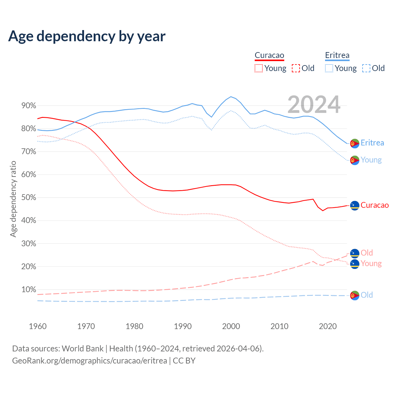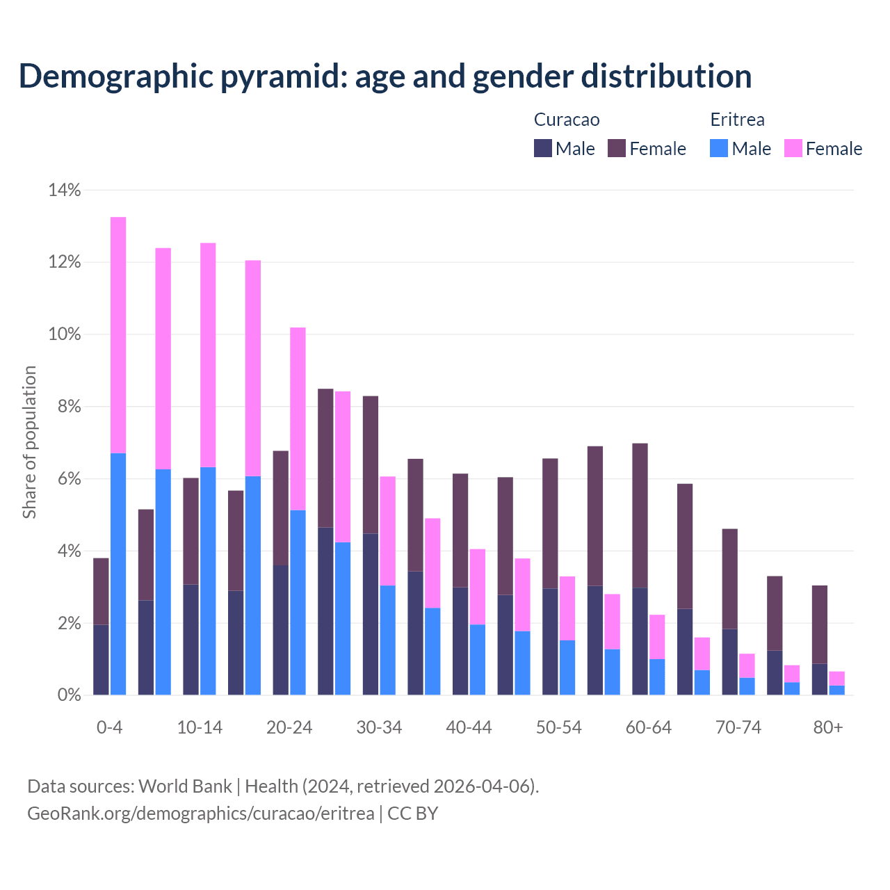 - The share of old-age demographic (65+) in Curacao is 16.8% vs 4.2% in Eritrea.