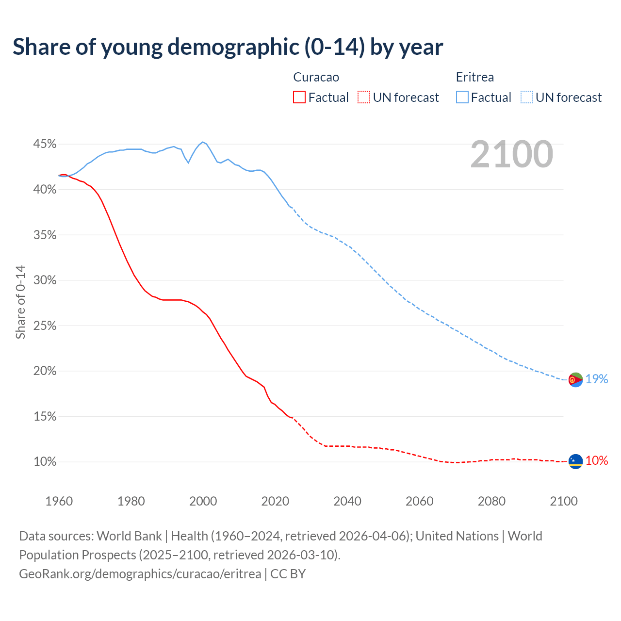 - The share of young demographic (0-15 years old) in Curacao is 14.9% vs 38.1% in Eritrea.