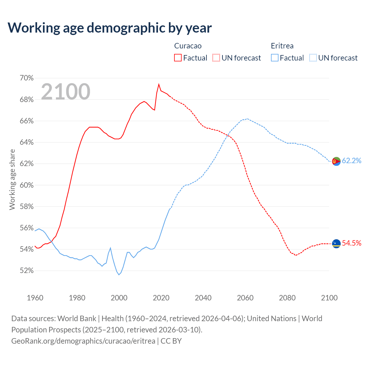 - Curacao has 107K working age adults (aged 15-64) vs 2.13M in Eritrea.