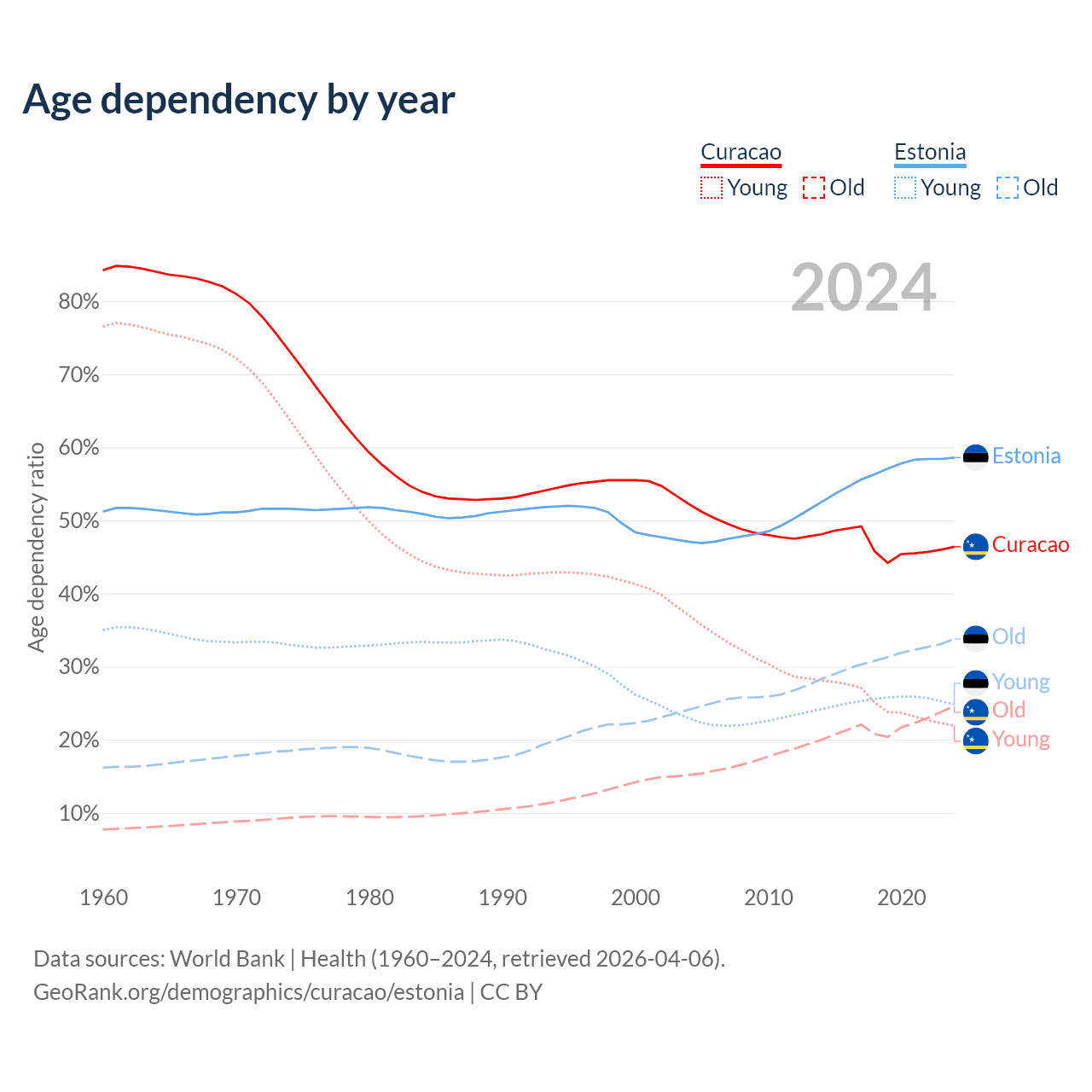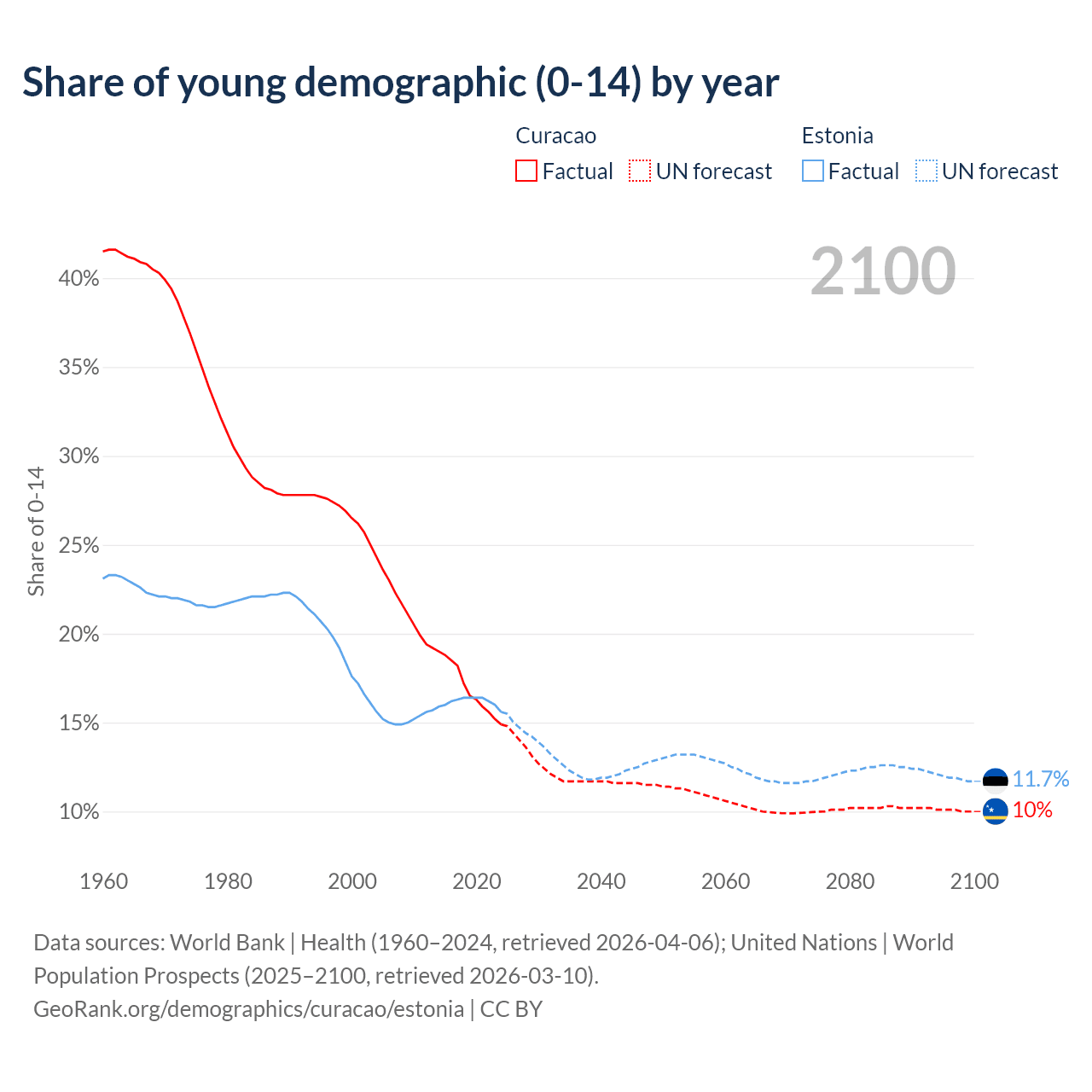 - The share of young demographic (0-15 years old) in Curacao is 14.9% vs 15.6% in Estonia.