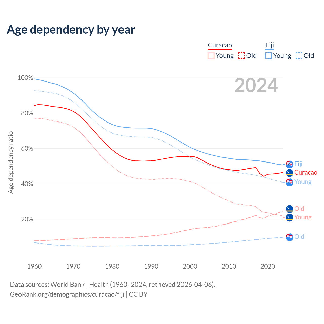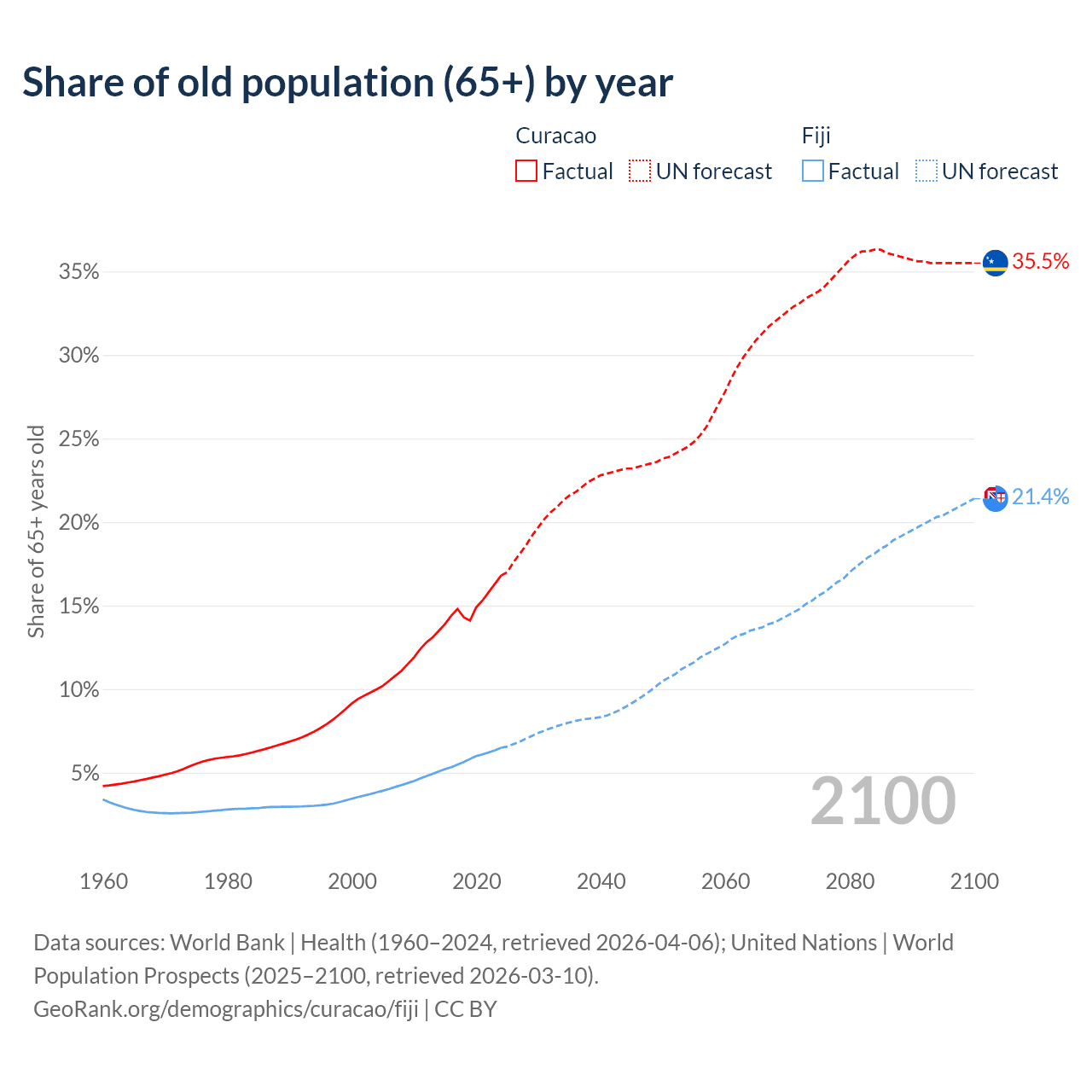 - The share of old-age demographic (65+) in Curacao is 16.8% vs 6.49% in Fiji.