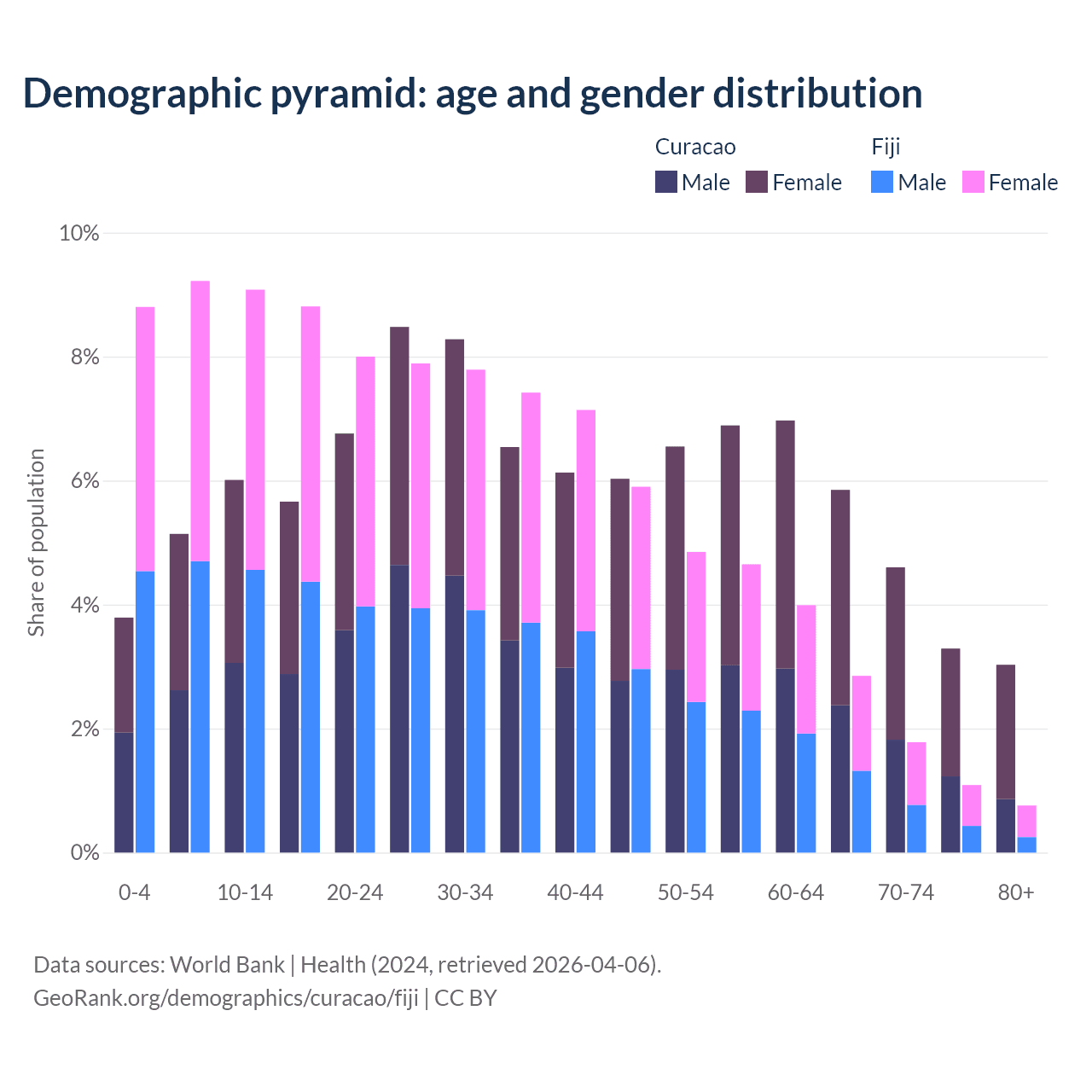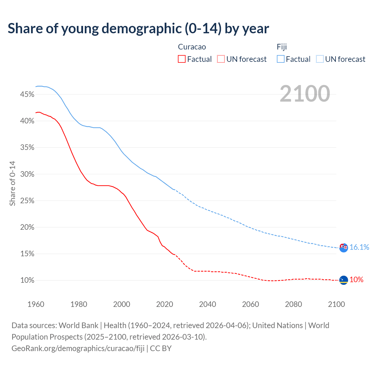 - The share of young demographic (0-15 years old) in Curacao is 14.9% vs 27.1% in Fiji.