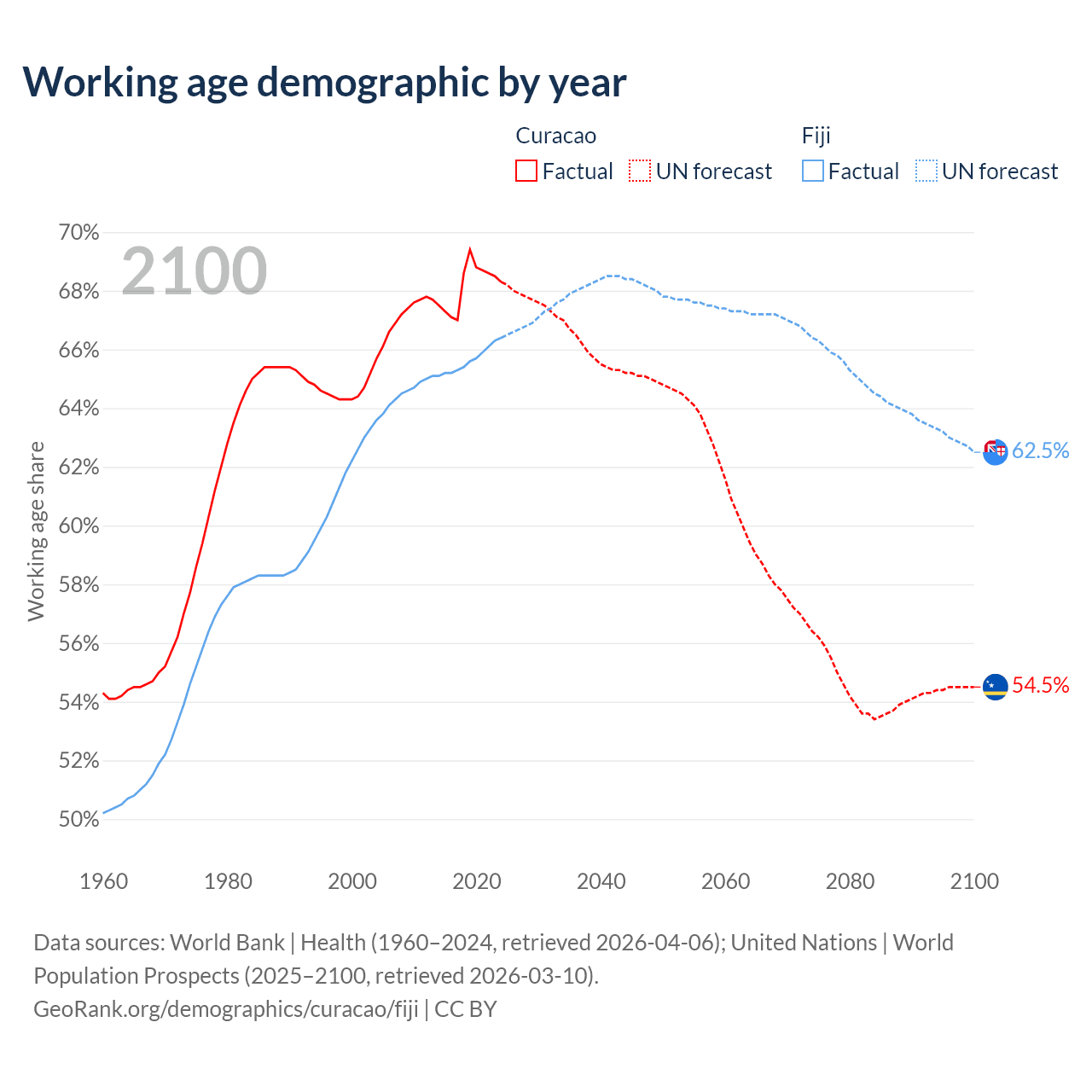 Median age Curacao vs Fiji, 1960-2100