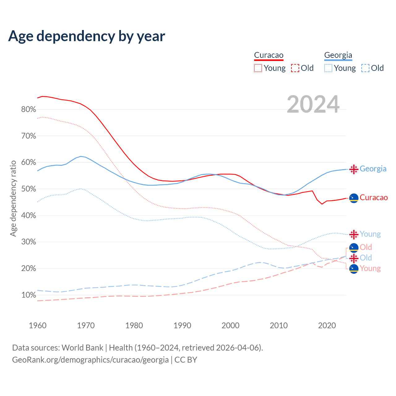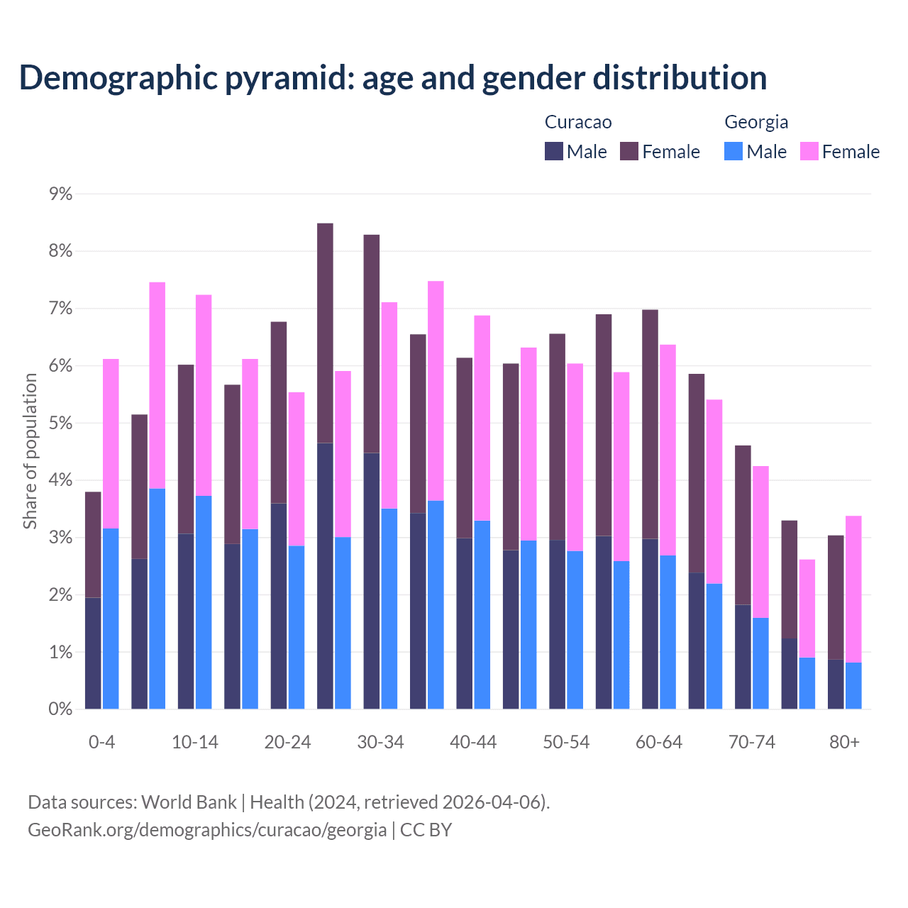 - The share of old-age demographic (65+) in Curacao is 16.8% vs 15.6% in Georgia.