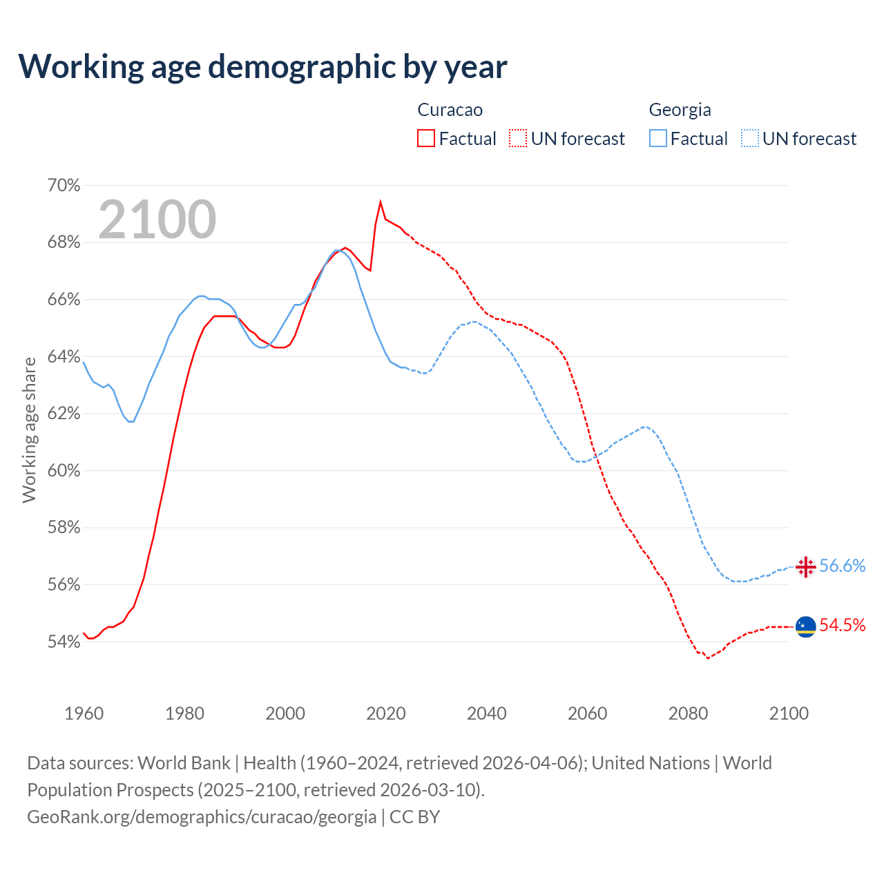 Median age Curacao vs Georgia, 1960-2100